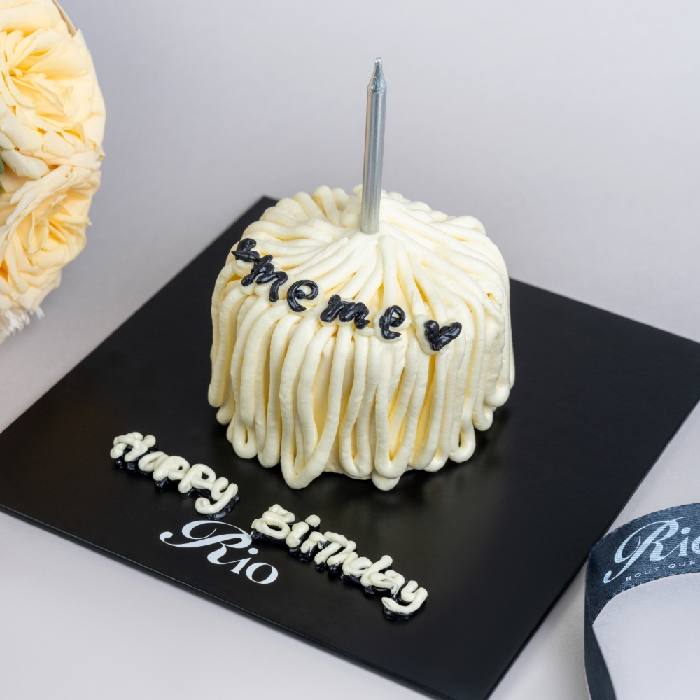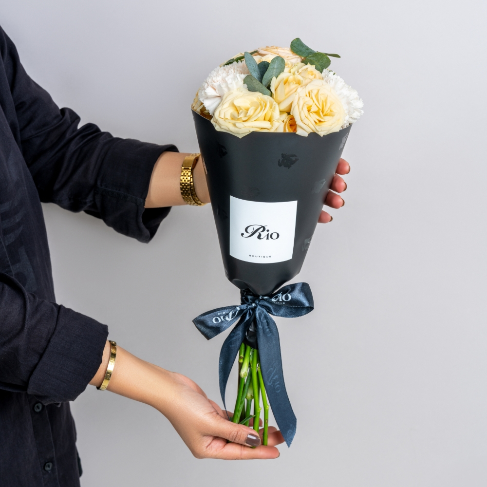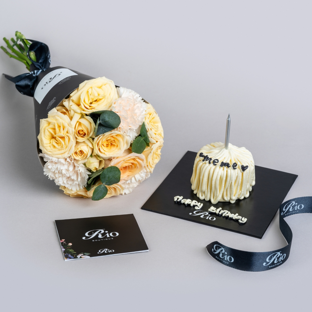 باقة يد تضم الجوري، البيبي جوري والكارنيشن مع كيكة. مثالية لأعياد الميلاد أو أي احتفال حلو.