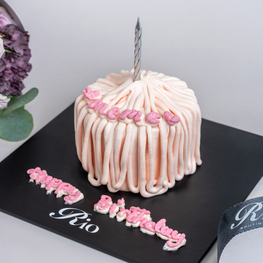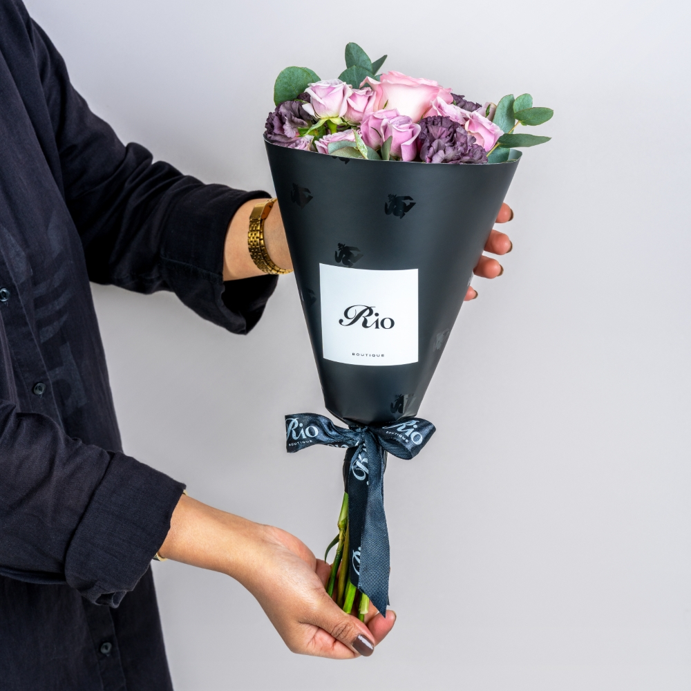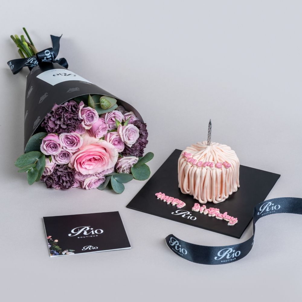 باقة يد ساحرة تضم الجوري، البيبي جوري والكارنيشن مع كيكة. مثالية كهدية دافئة لأعياد الميلاد أو أي مناسبة.