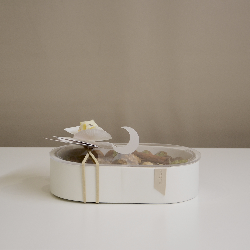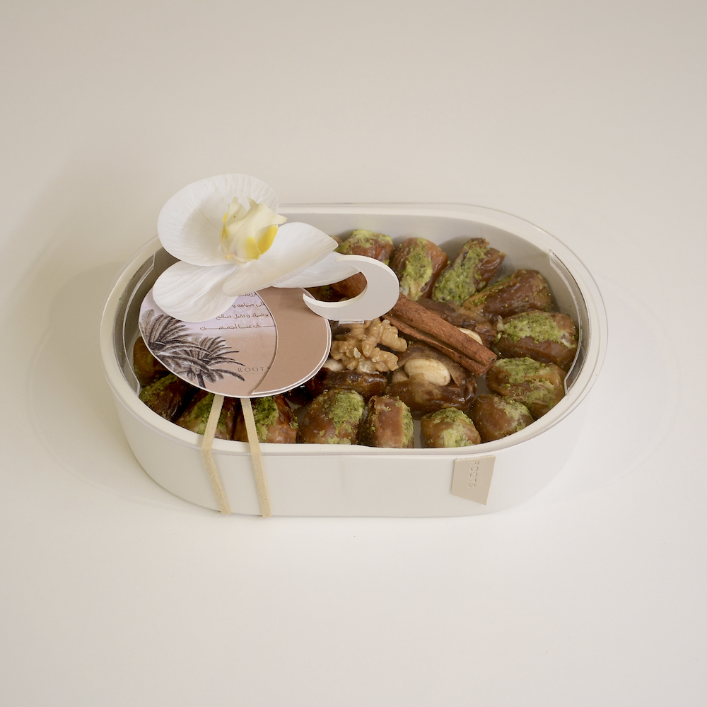 صينية خشبية أنيقة تضم تشكيلة من التمر المحشو بالمكسرات الفاخرة، مع غطاء أكريليك مزين بهلال رمضان، وبطاقة دعاء رمضانية، وأزهار الأوركيد.