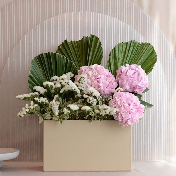 بوكس جلد يحتوي على زهور الكوبية باللون الوردي.