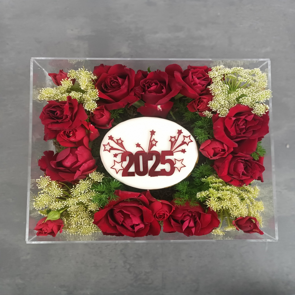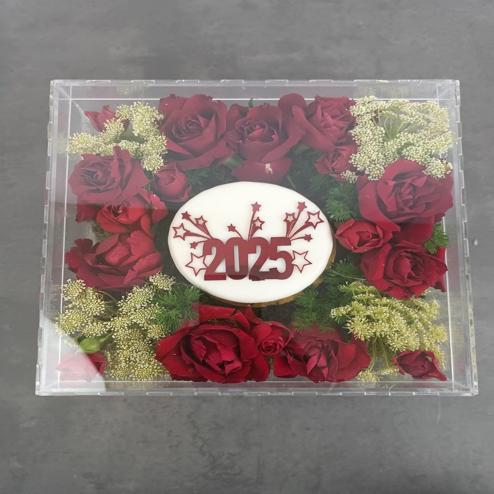 يحتوي الصندوق الأكريليكي على الجوري وكيكة.