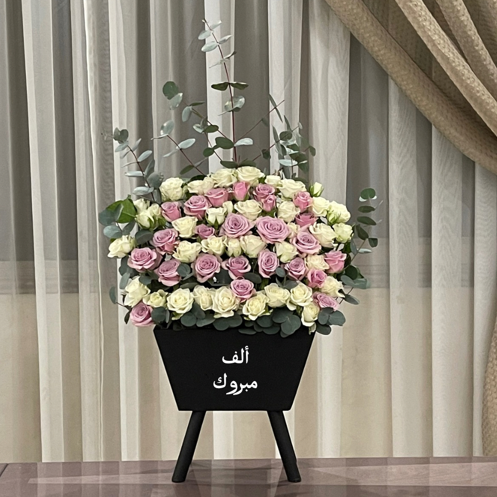 ستاند يحتوي على زهور الستروميريا والجوري.