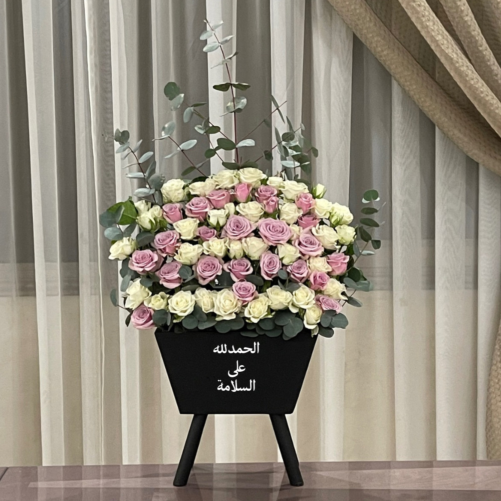 باقة تحتوي على البيبي جوري الأرجواني والأبيض، مرتبة بشكل جميل في ستاند.