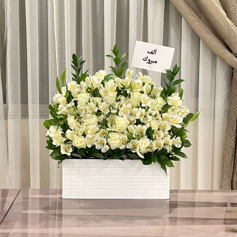 ستاند يحتوي على زهور الستروميريا والجوري.
