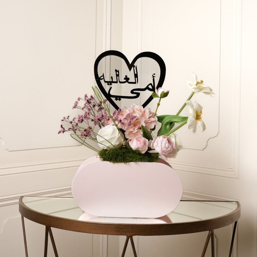 بوكس باللون الوردي بتصميم مزين بأزهار صناعية وتغريسة "أمي الغالية".