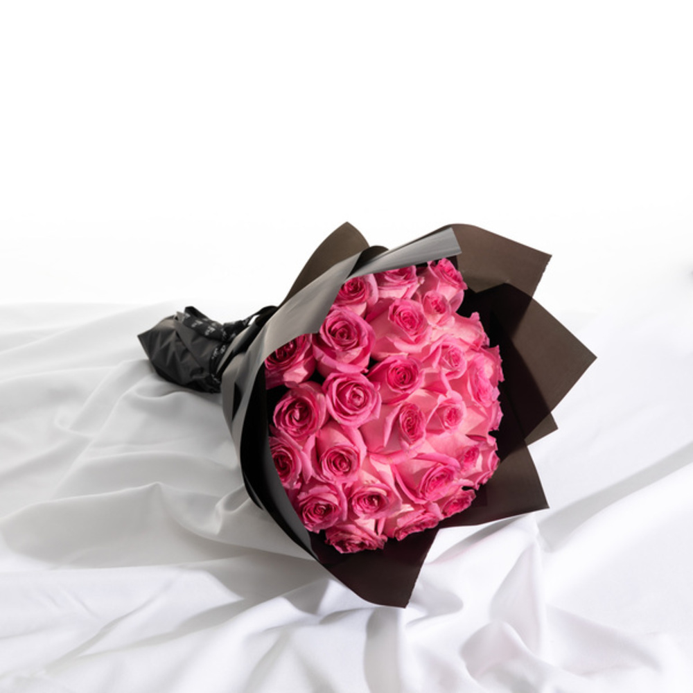باقة يد تحتوي على 30 زهرة جوري وردية، مرتبة بشكل جميل.