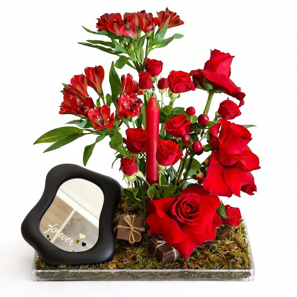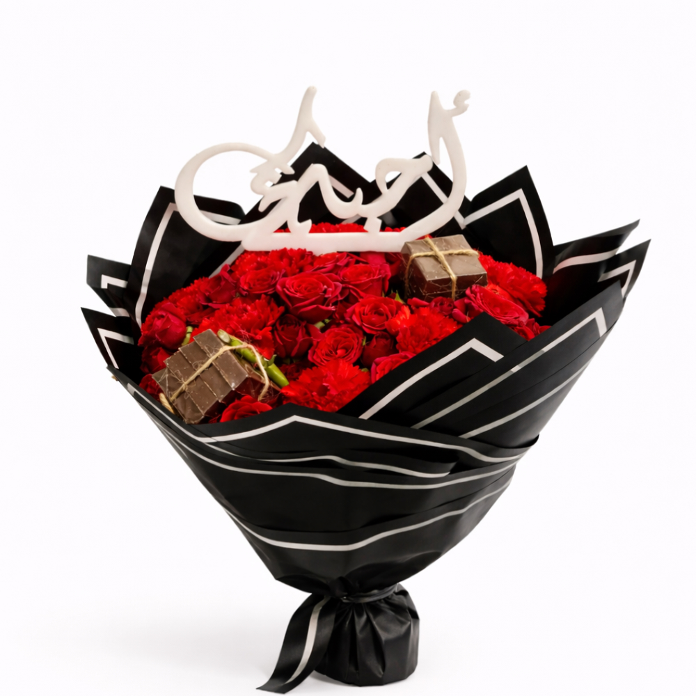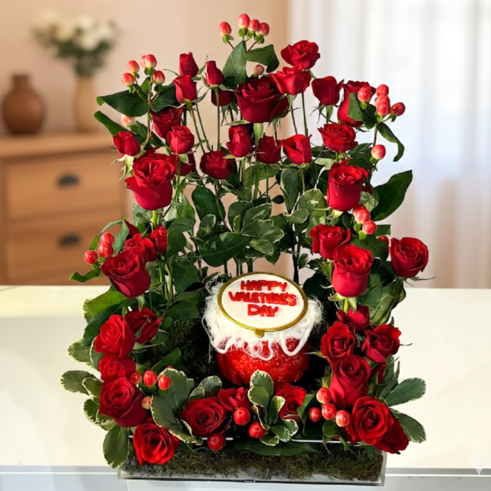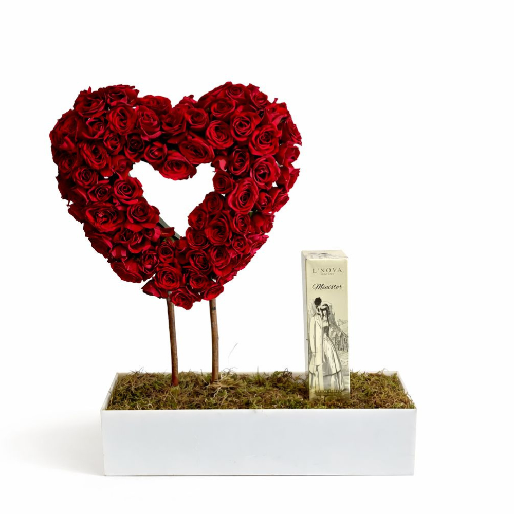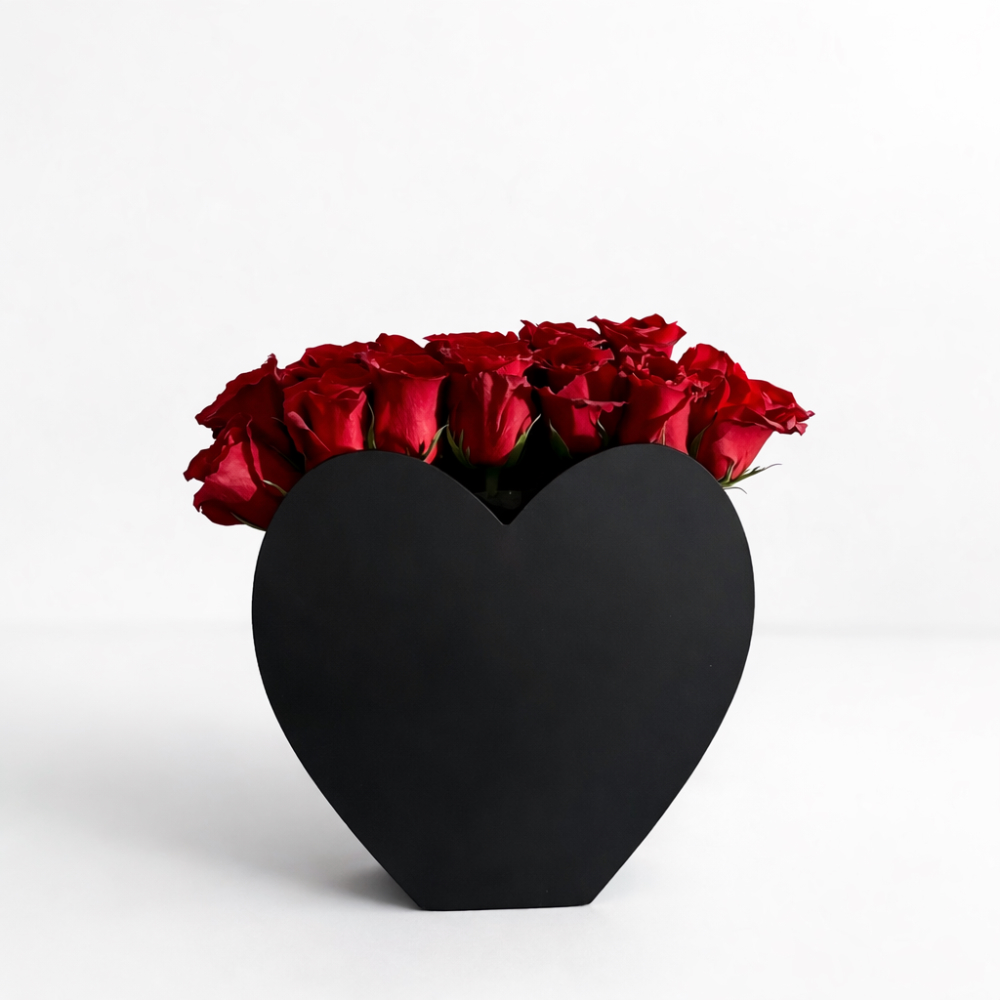 باقة من زهور الجوري الحمراء، مرتبة بشكل جميل في صندوق على بتصميم القلب. هدية كلاسيكية ورومانسية، مثالية للتعبير عن الحب والإخلاص.