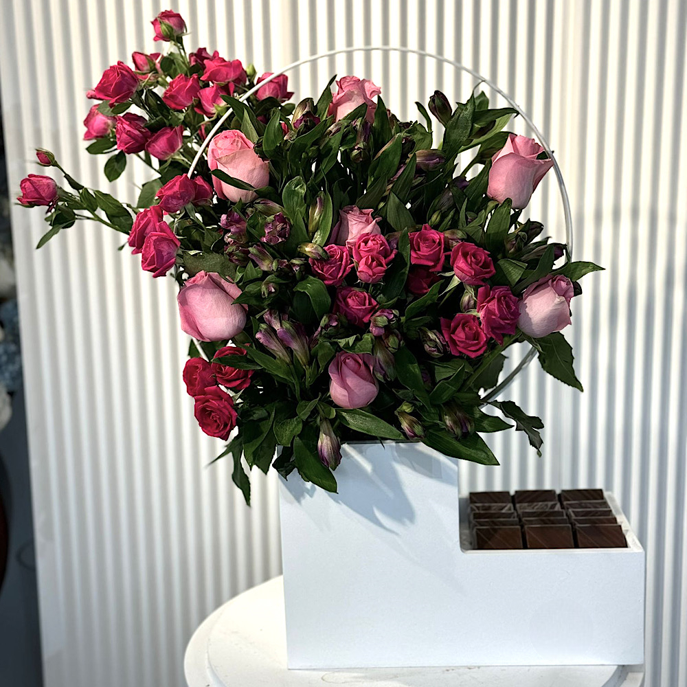 تحتوي الباقة على الجوري والبيبي جوري الوردي مع الشوكولاتة البلجيكية.