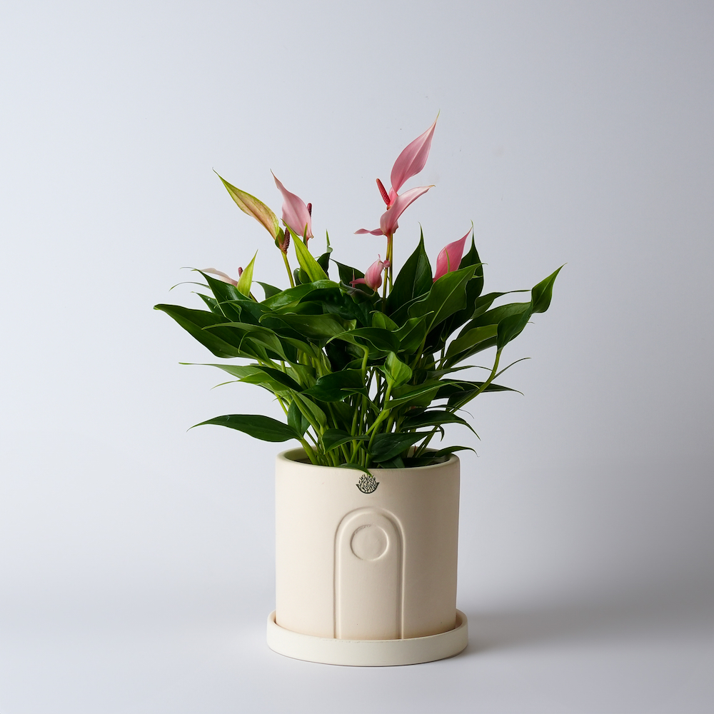 نبتة الأنثوريوم ليلي مرتبة في وعاء. تنمو في الداخل مع ضوء الشمس غير المباشر. تحتاج إلى حوالي 80 مل من الماء كل 4-6 أيام.