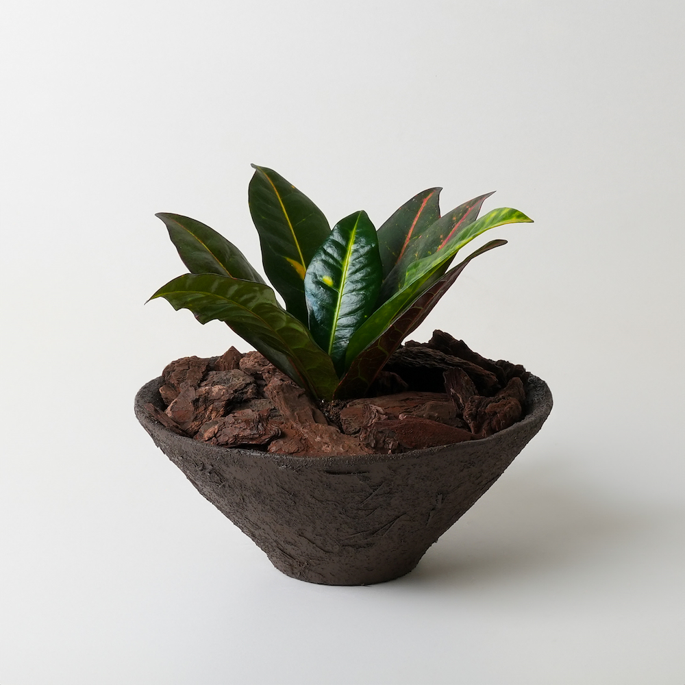 نبتة كوديايوم مرتبة في وعاء ترابي. تنمو في الداخل مع ضوء الشمس غير المباشر. تحتاج إلى حوالي 100 مل من الماء كل 6-7 أيام.