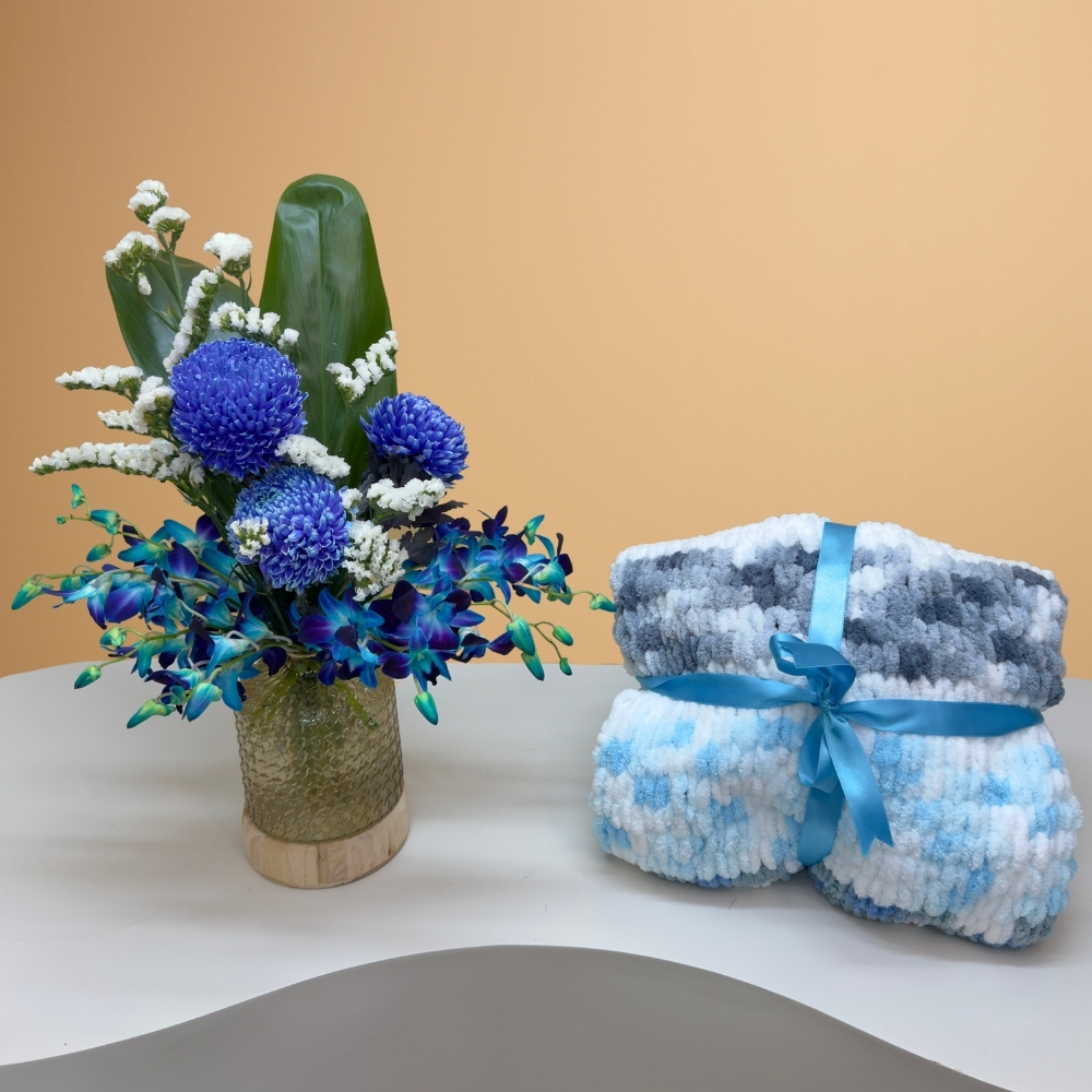 فازة تحتوي على الاوركيد، الكريز والستاتس مع بطانية زرقاء منفوشة مصنوعة يدويًا.