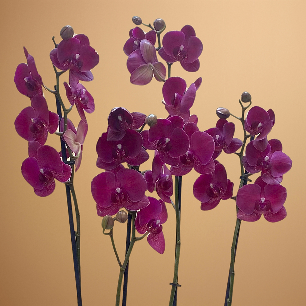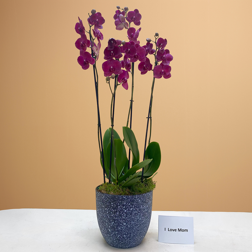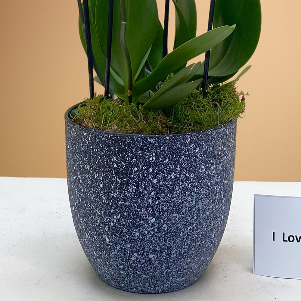 باقة تحتوي على نباتات أوركيد مونترو، مرتبة بشكل جميل في أصيص منقط باللون الأسود.