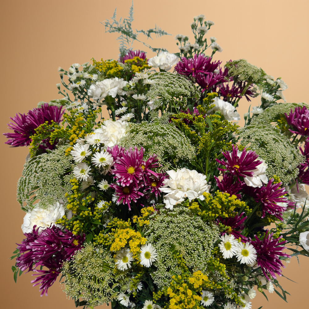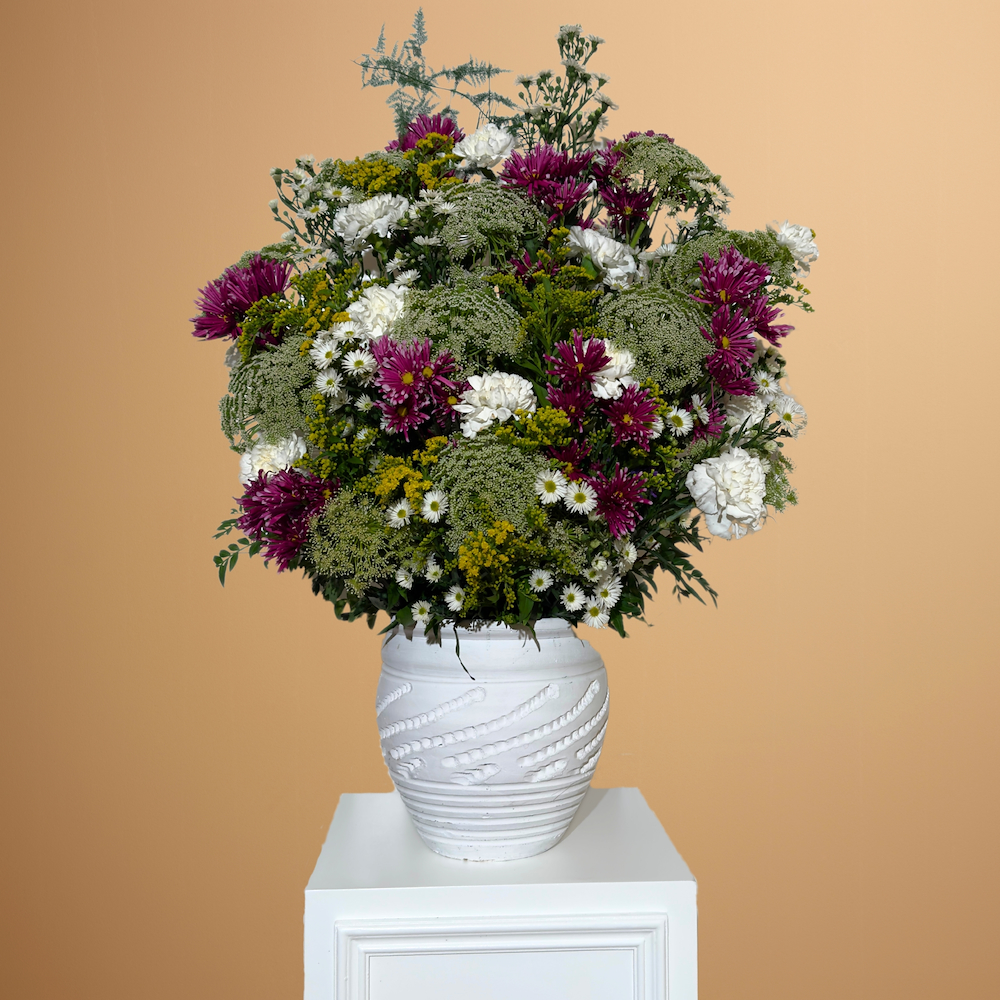 باقة بأزهار الامي ماجوس والكريزانتم والكارنيشن والسوليداجو موضوعة في بلانتر سيراميك أنيق لتمنح المكان لمسة طبيعية راقية ومظهرا جميلا ومنعشا.
