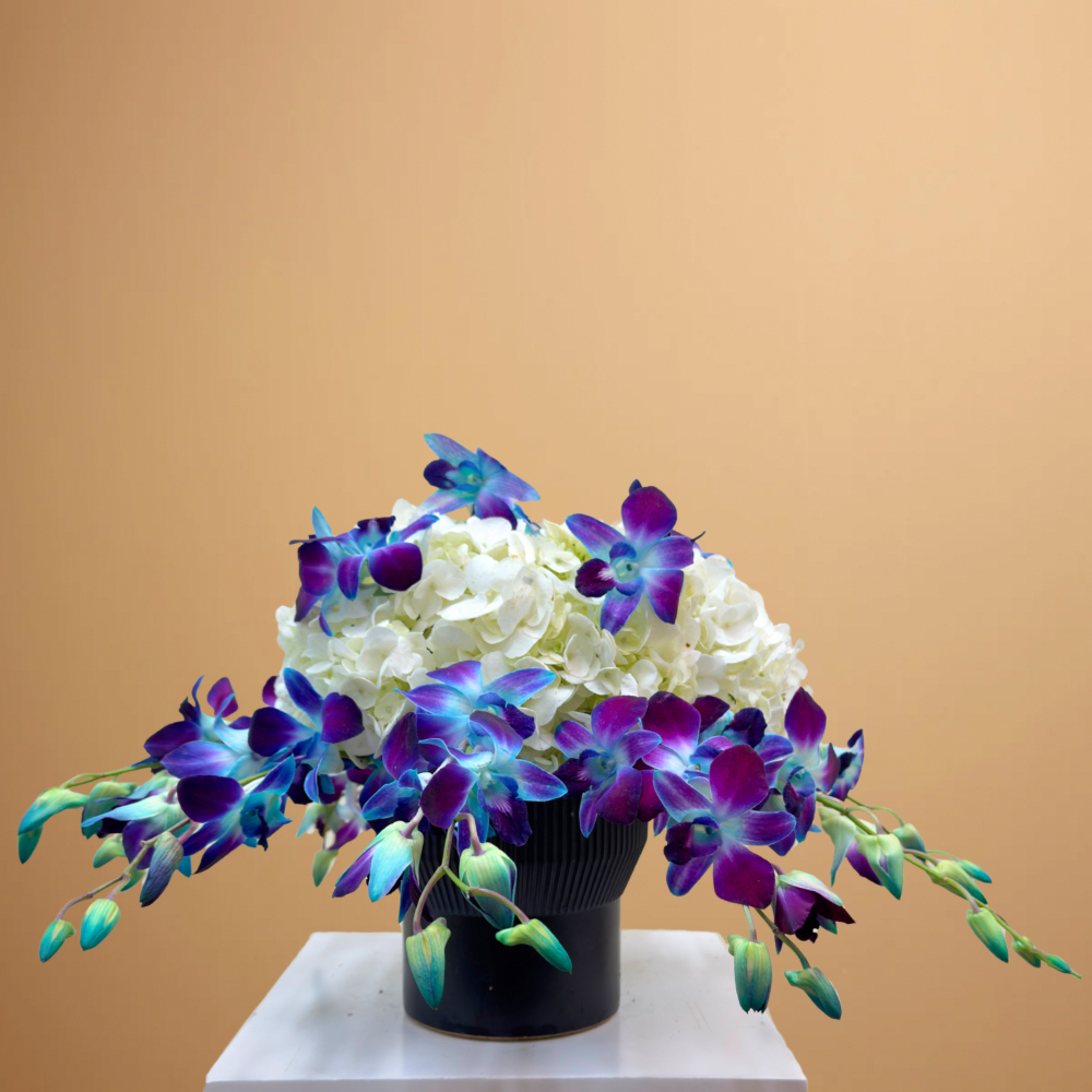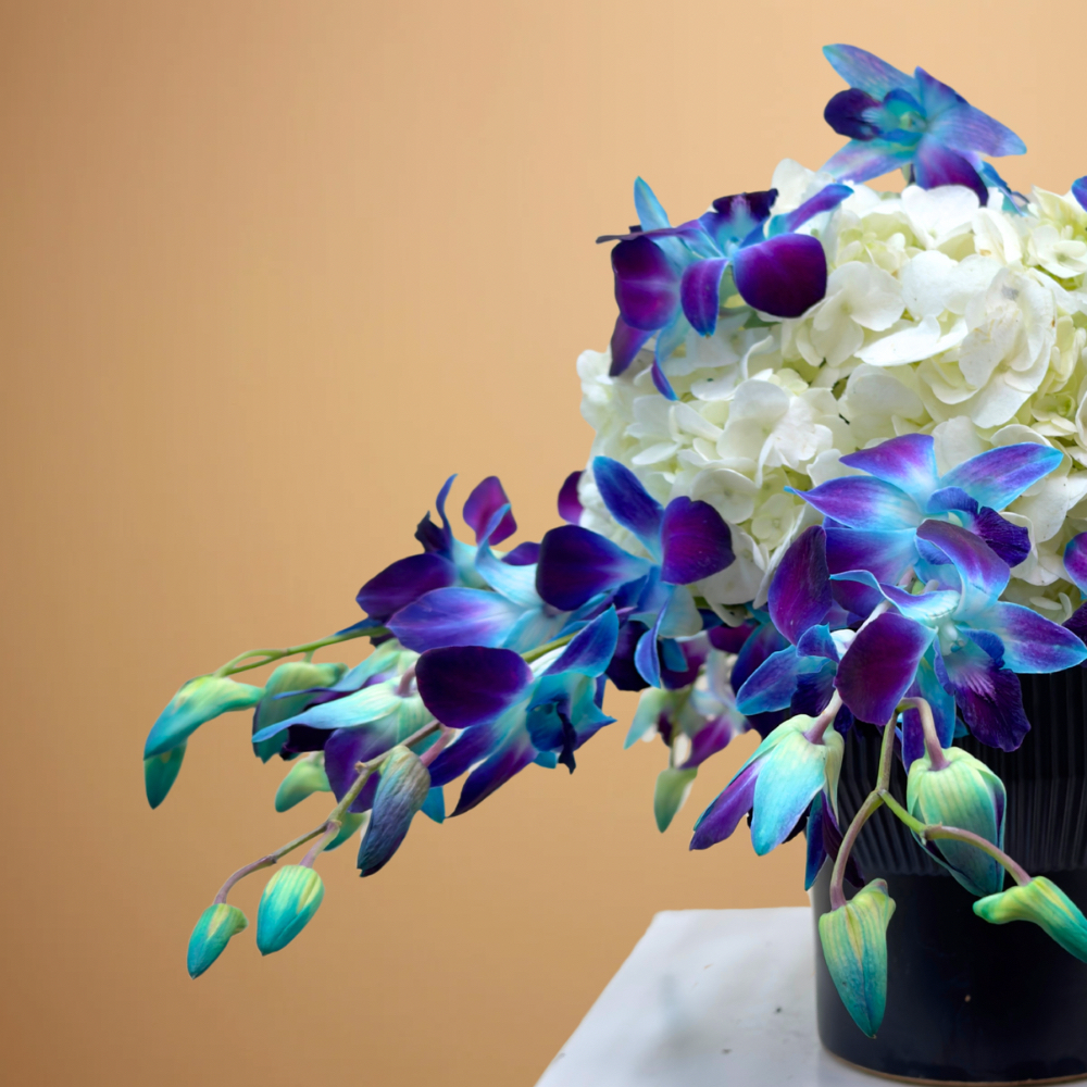 زهور البيبي أوركيد الزرقاء والهايدرينجا البيضاء، مرتبة بشكل جميل في فازة سوداء.