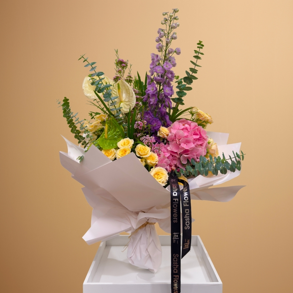 باقة يد مليئة بأزهار الجوري، الدلفينيوم، الهايدرنجا، أزهار الواكس والأنثوريوم.