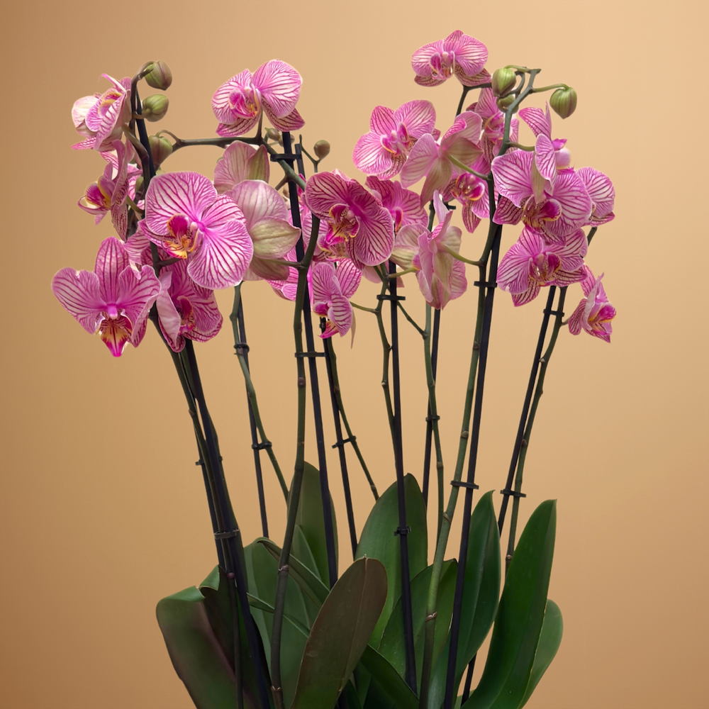 فازة أنيقة مليئة بنباتات الأوركيد باللون الوردي.