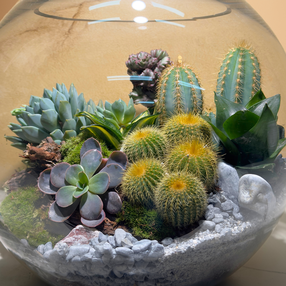 نباتات لفربيون لاكتيا الصبار، باروديا واراسي، بيلوسيريوس أزيروس الصبار، إشيفيريا، وبيتونيا، مرتبة بزجاج التررم.