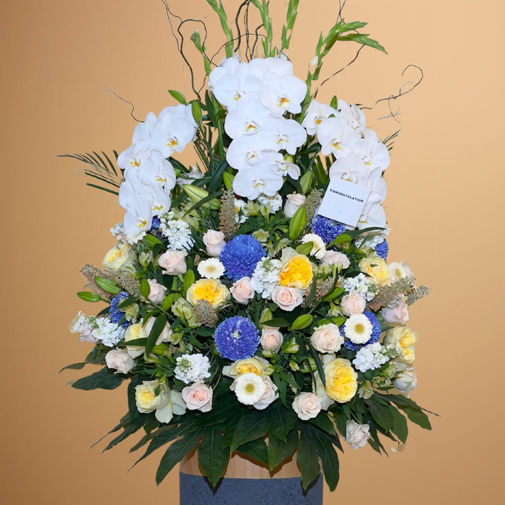 فازة خزفية رمادية محشوة بزهور الفاوانيا، الأوركيد الأبيض، الكازابلانكا، الجربيرا والجوري.