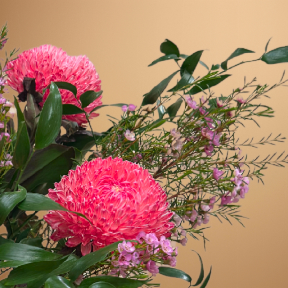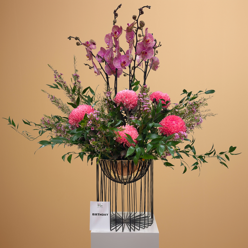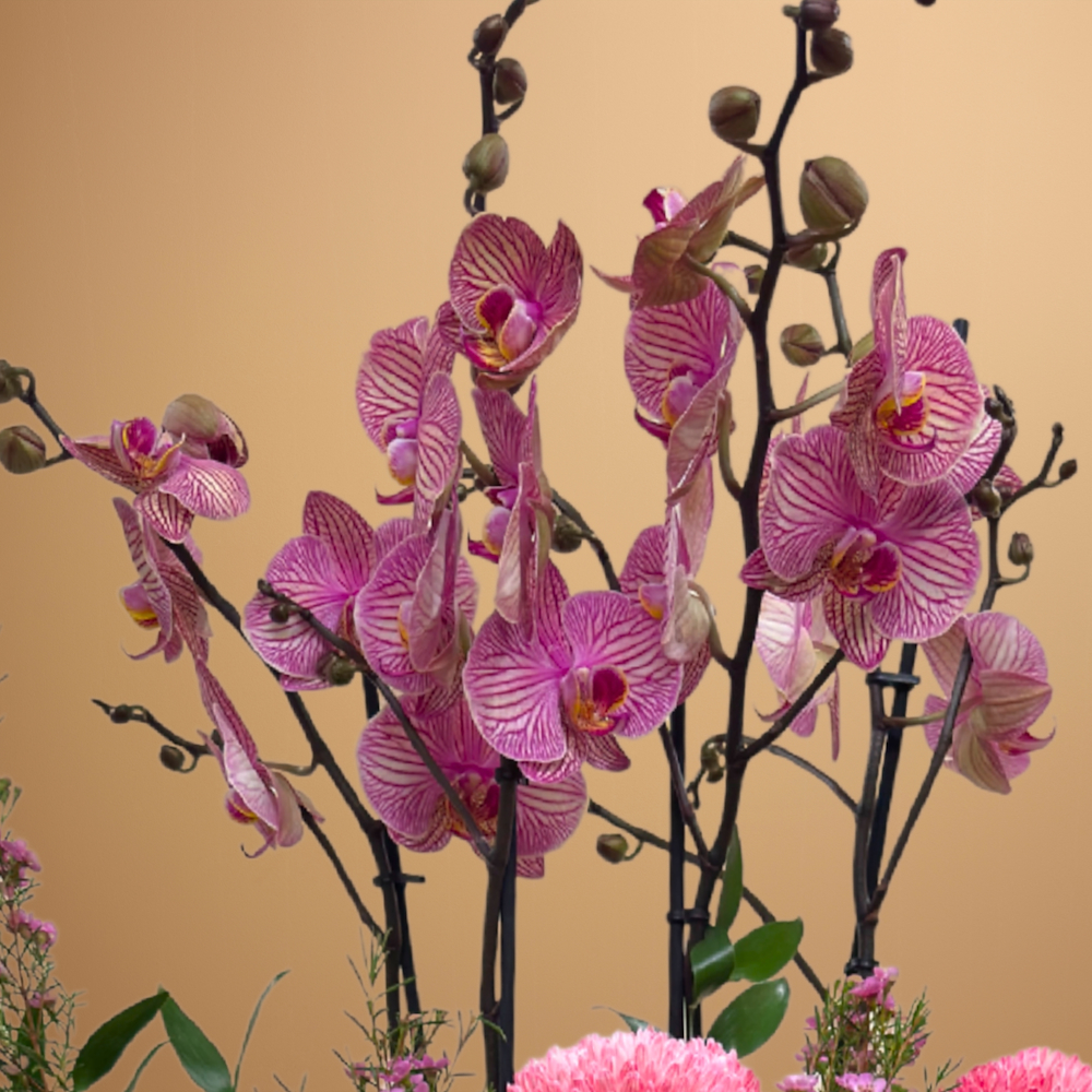 باقة تحتوي على السيمبيديوم، زهرو الواكس والكريز.