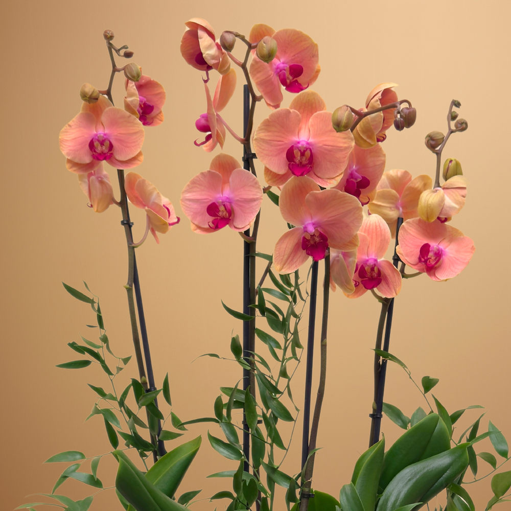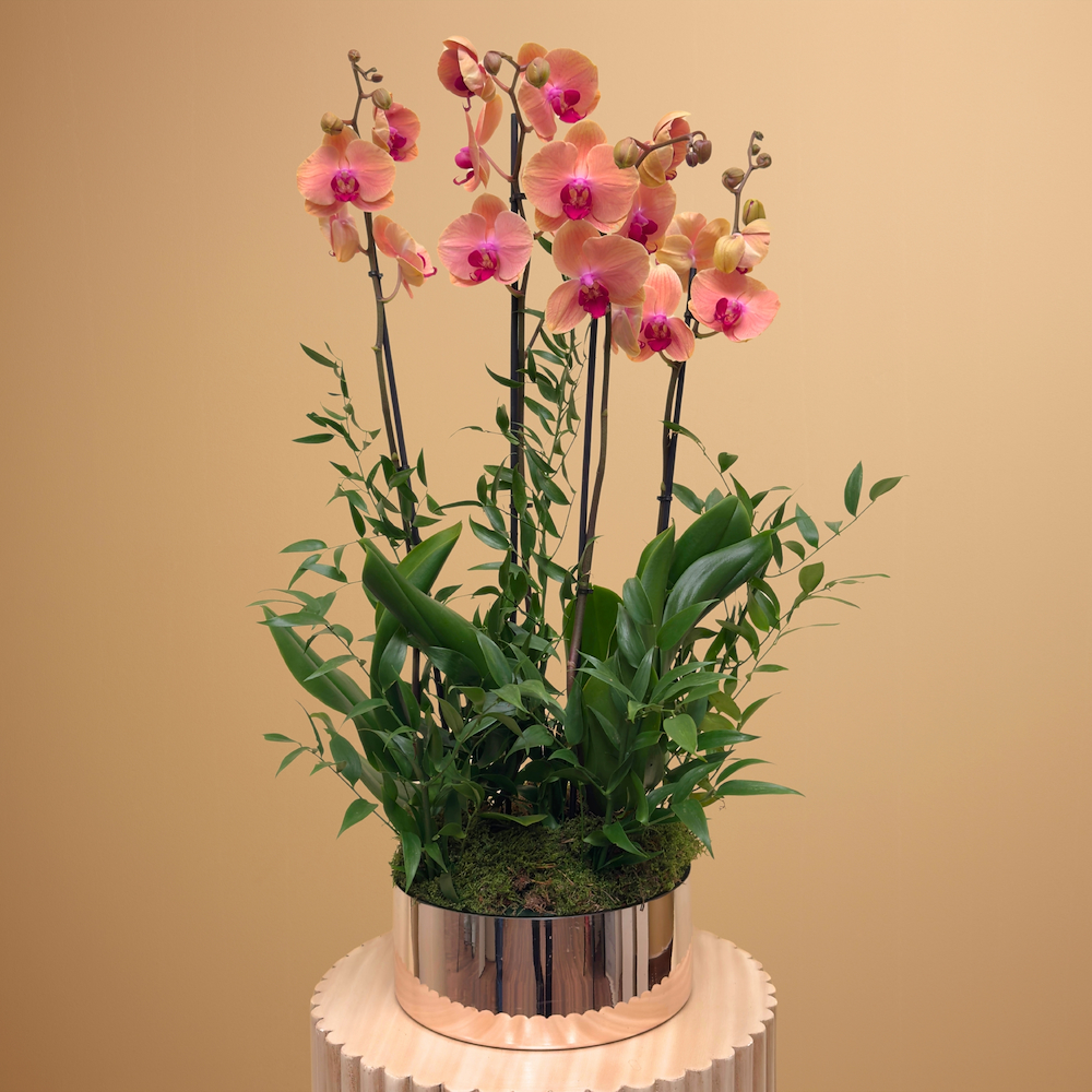 فازة أنيقة باللون الروز قولد مليئة بنباتات الأوركيد باللون المشمشي الكاريبي وأوراق الروسكاس.