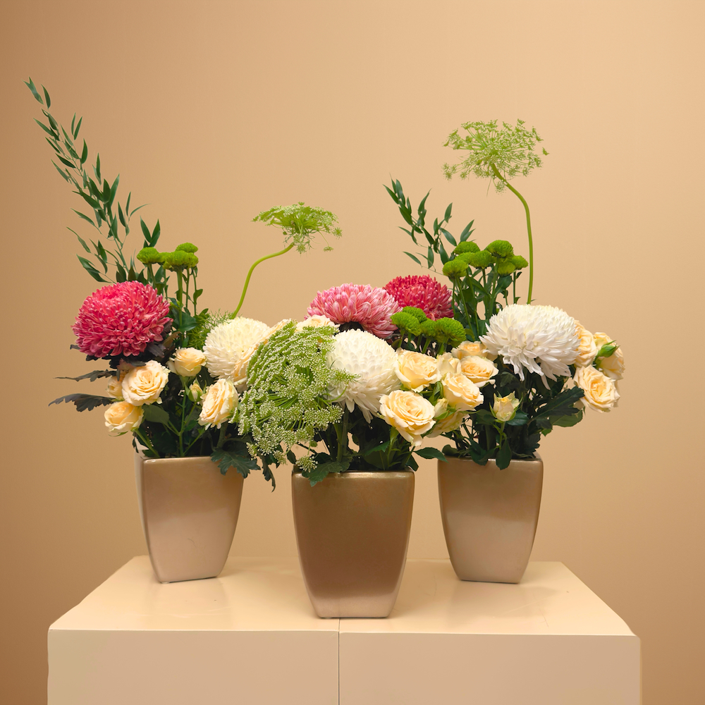 فازة فخارية باللون الذهبي الفاتح تحتوي على بوكيه من أمي ماجوس وكريمن أبيض ووردي وجوري صغير أصفر فاتح وأقحوان أخضر.