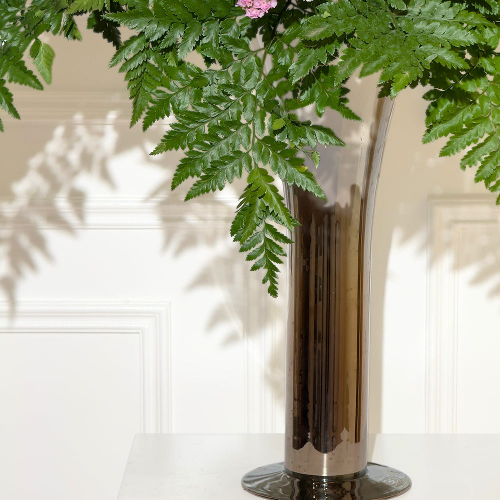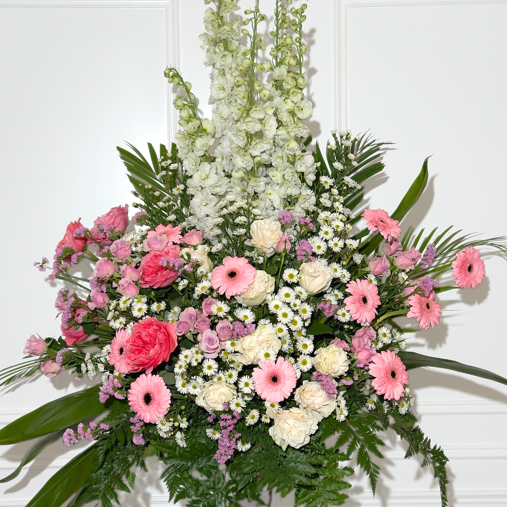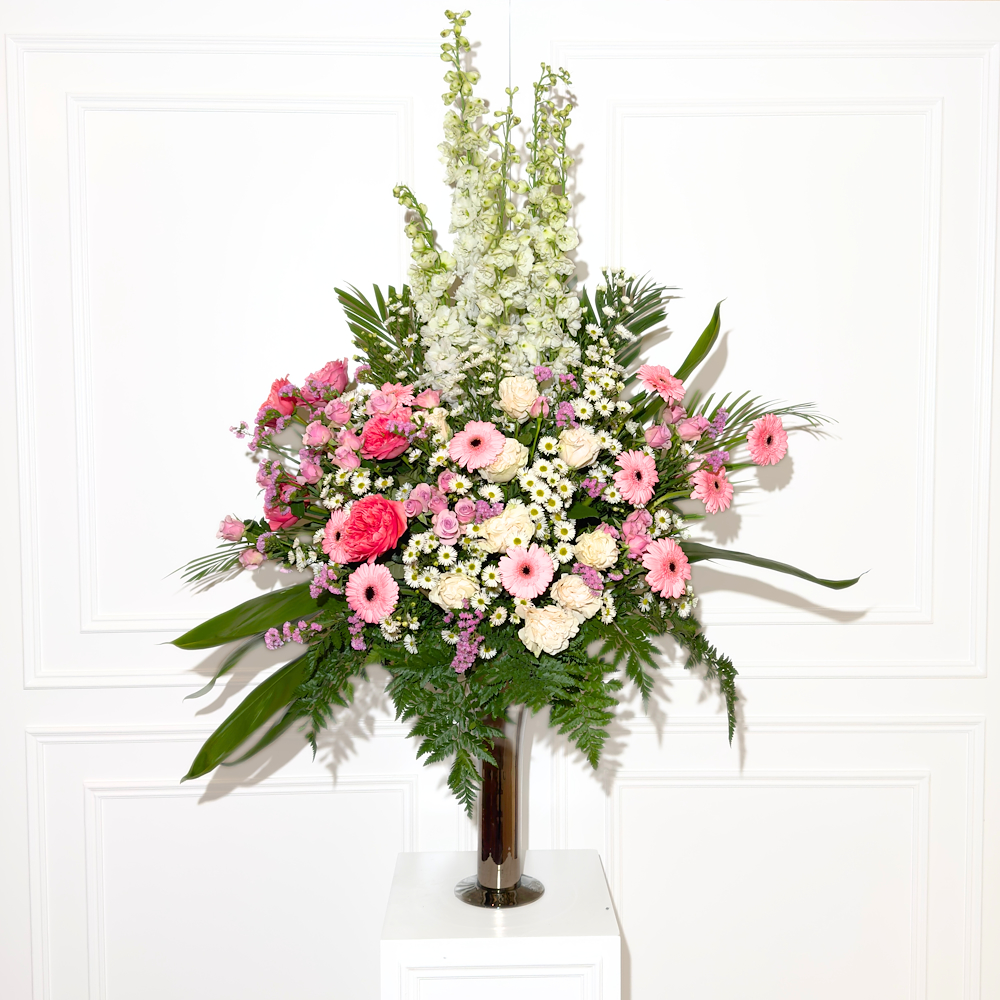 فازة تحتوي على الجوري، البيبي جوري، الجيربيرا، الدلفينيوم والاقحوان.