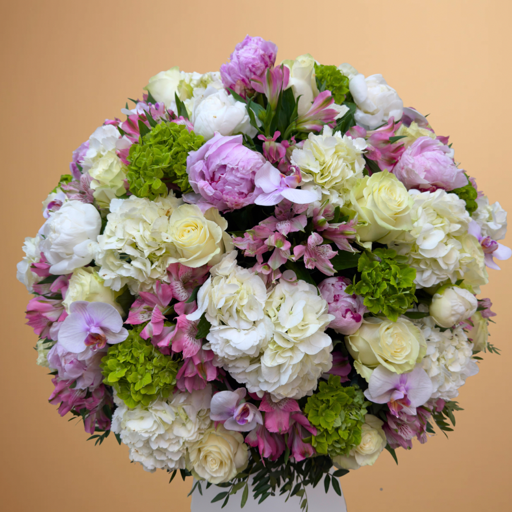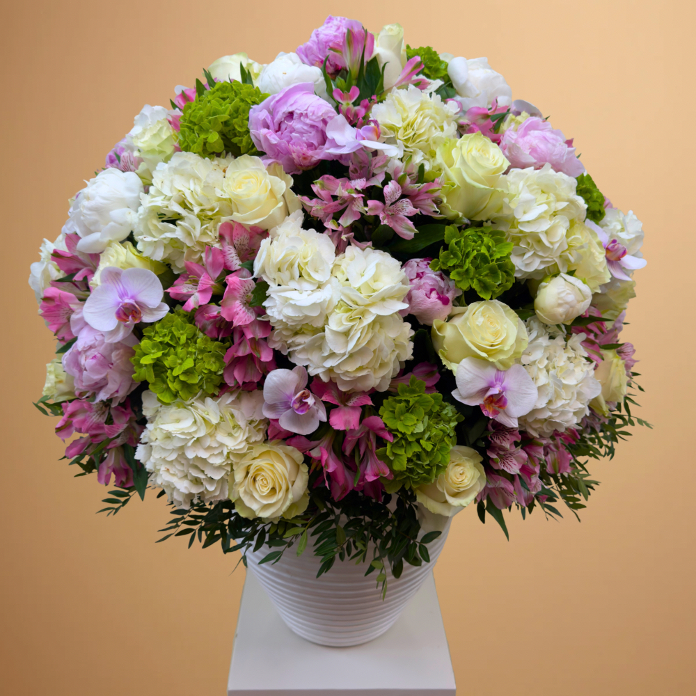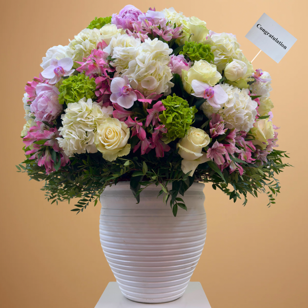 باقة تحتوي على زهور البيوني، الجوري، الأوركيد، الهايدرينجا والألستروميريا، مرتبة بشكل جميل في فازة بيضاء من السيراميك.