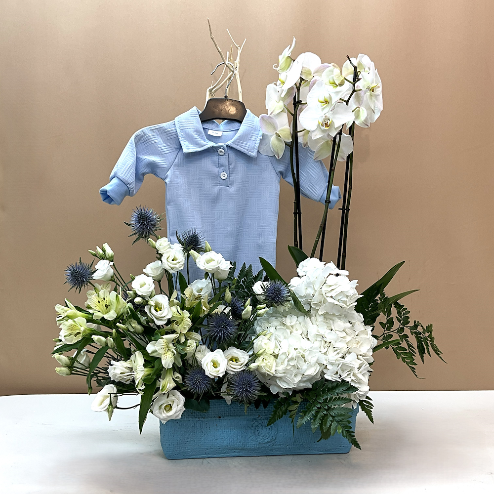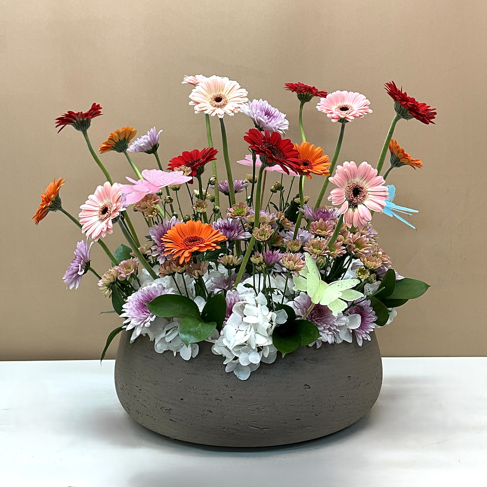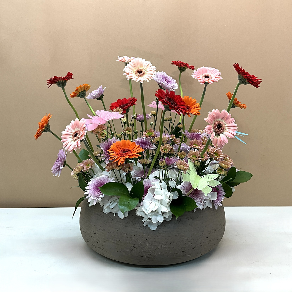 وعاء بيج اللون يحتوي على زهور الجربيرا، الهايدرينجا والكريز، مرتبة بشكل جميل.
