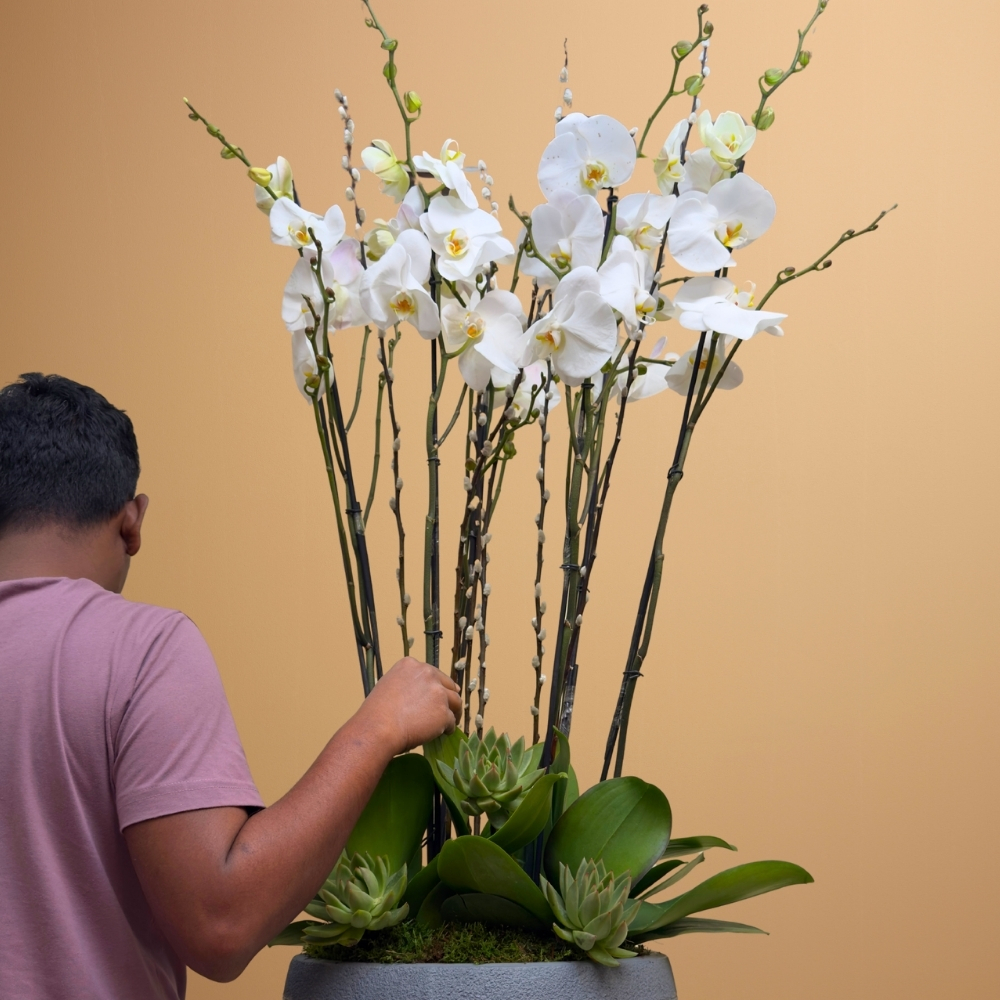 نباتات أوركيد بيضاء ضخمة مع أغصان الصفصاف في وعاء خزفي رمادي.