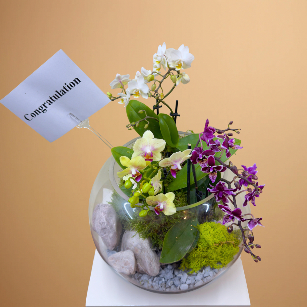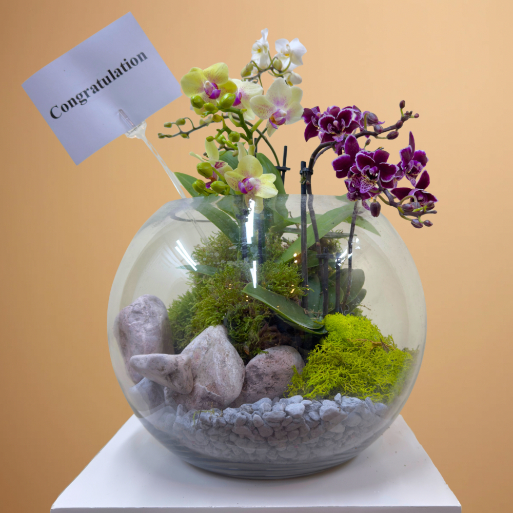باقة تحتوي على نباتات الأوركيد الصغيرة، مرتبة بشكل جميل في حوض زجاجي.