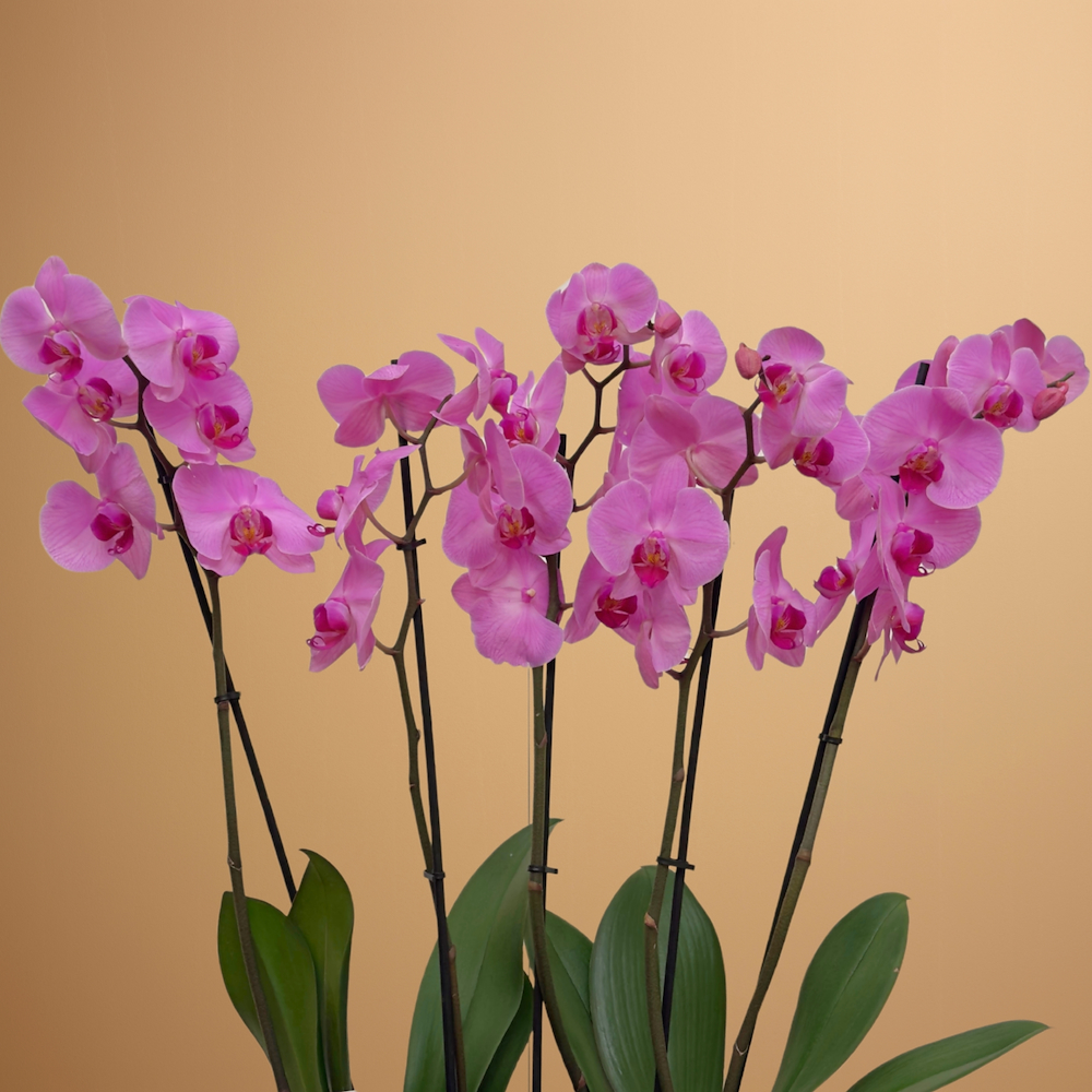 نبات أوركيد أورلاندو الوردي في فازة سوداء على شكل قارب.