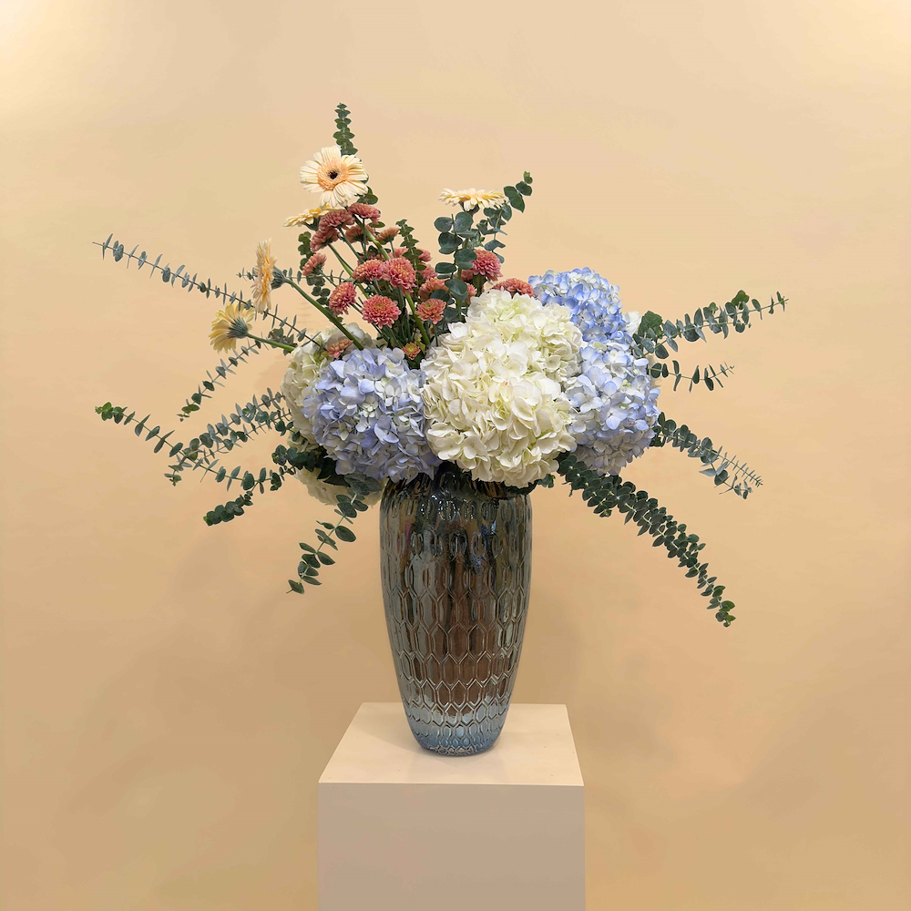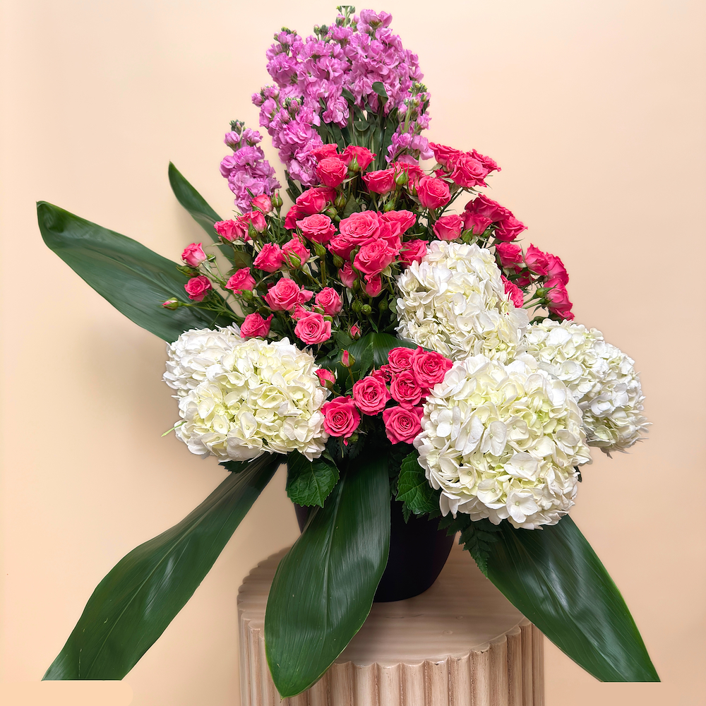 فازة مليئة بالجوري، الماثيولا والهايدرنجا.