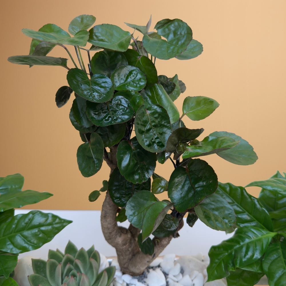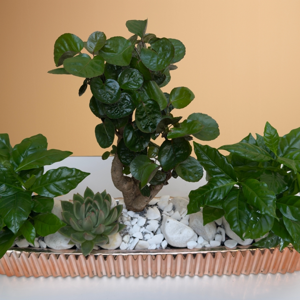نباتات بوليسكياس فابيان ونباتات قهوة مزروعة في مزهرية ذهبية وردية.