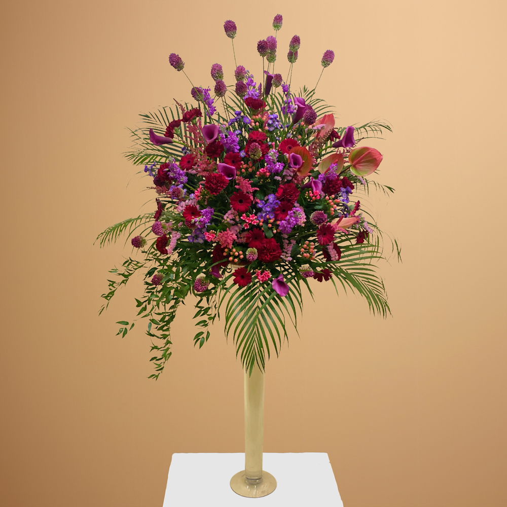 باقة تحتوي على زهور الأنثوريوم، البوفارديا، الكارنيشن، الكالا ليلي، الدلفينيوم، والجيربيرا، مرتبة بشكل جميل في فازة زجاجية.