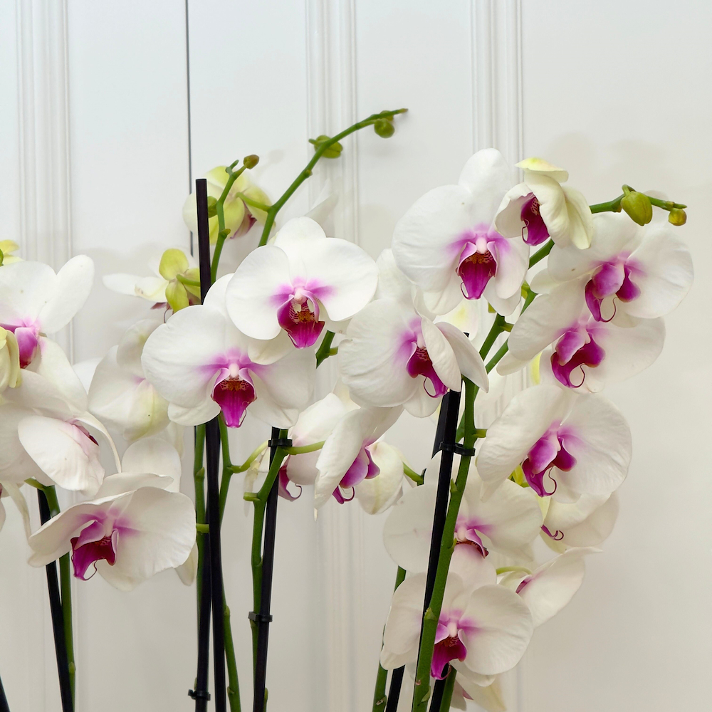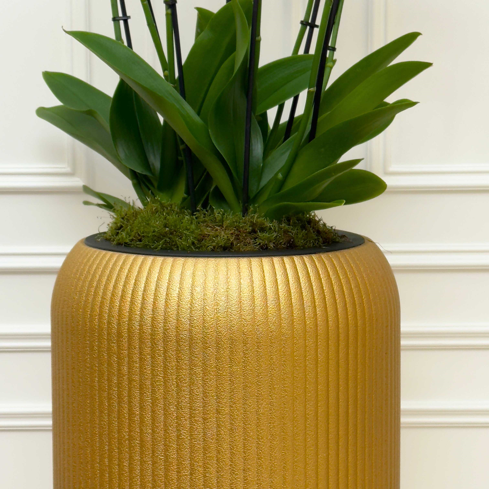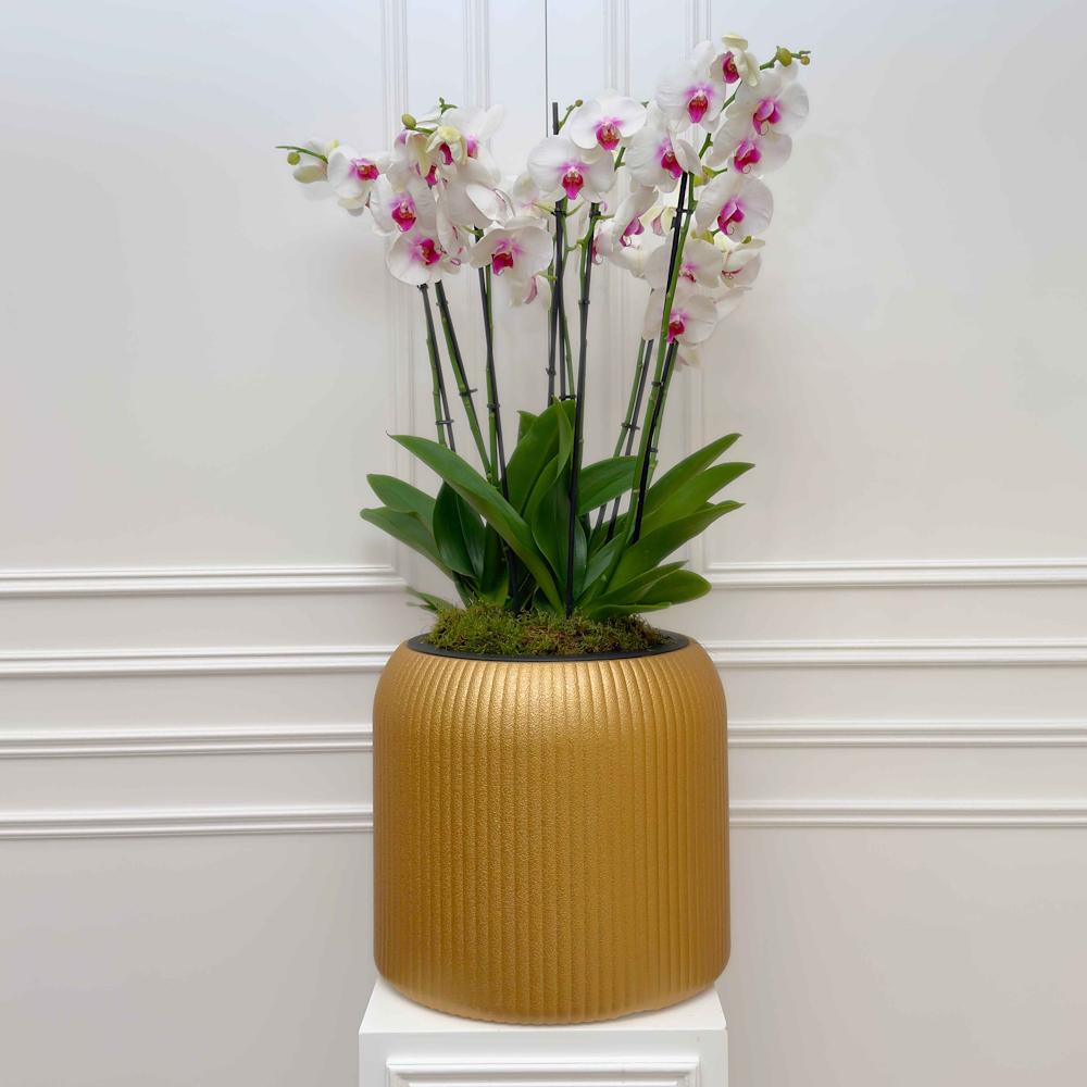 وعاء من الألياف الذهبية يحتوي على الاوركيد الابيض.