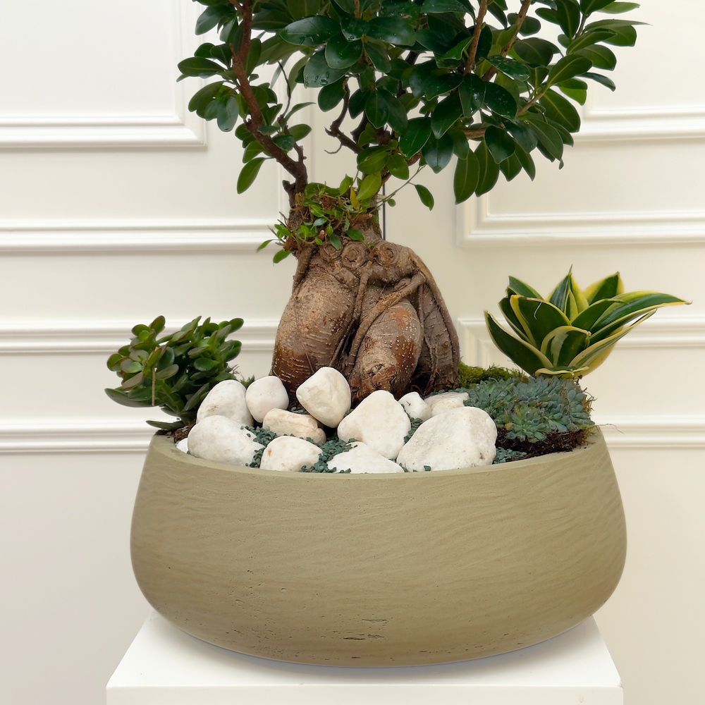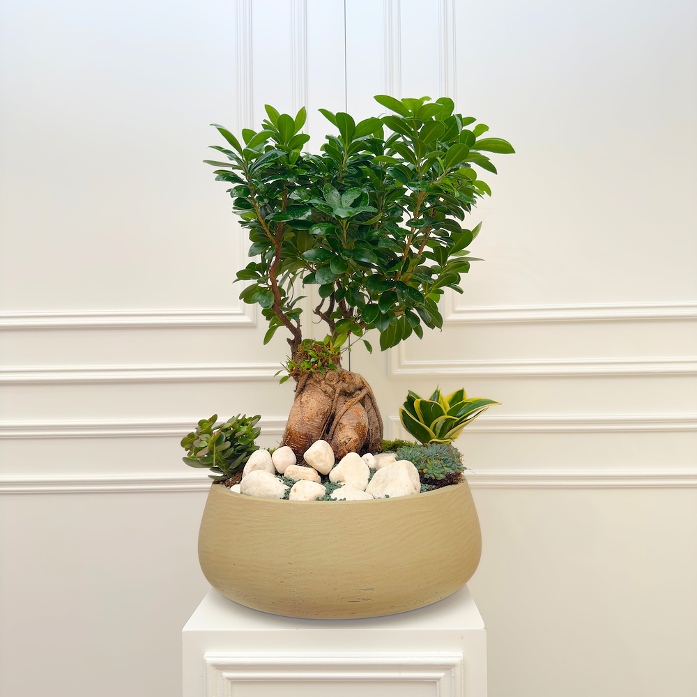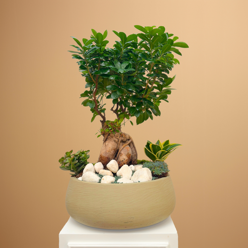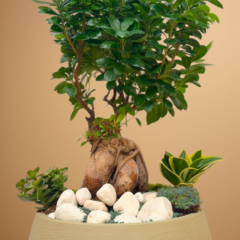 فازة تحتوي على بونساي فيكس جينسنغ مع سانسيفيريا وكراسولا.
