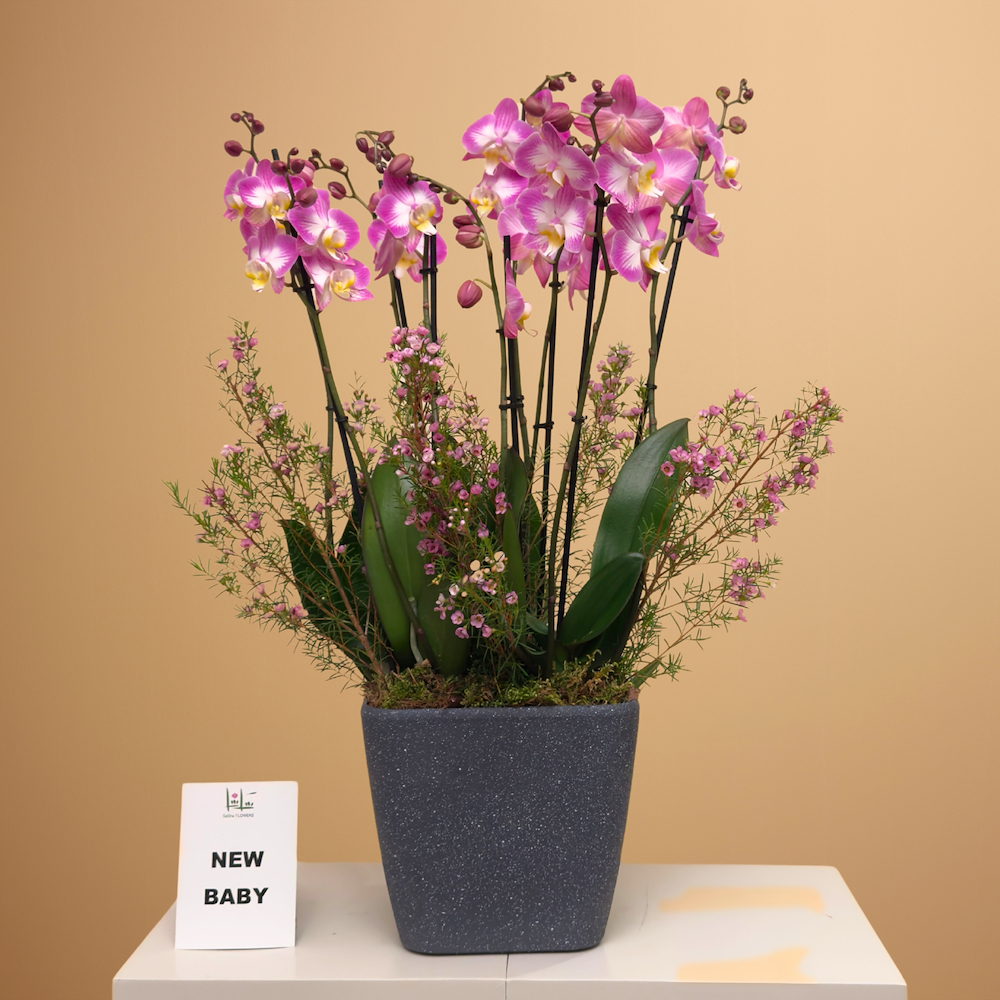 فازة تحتوي على الاوركيد وزهور الواكس.
