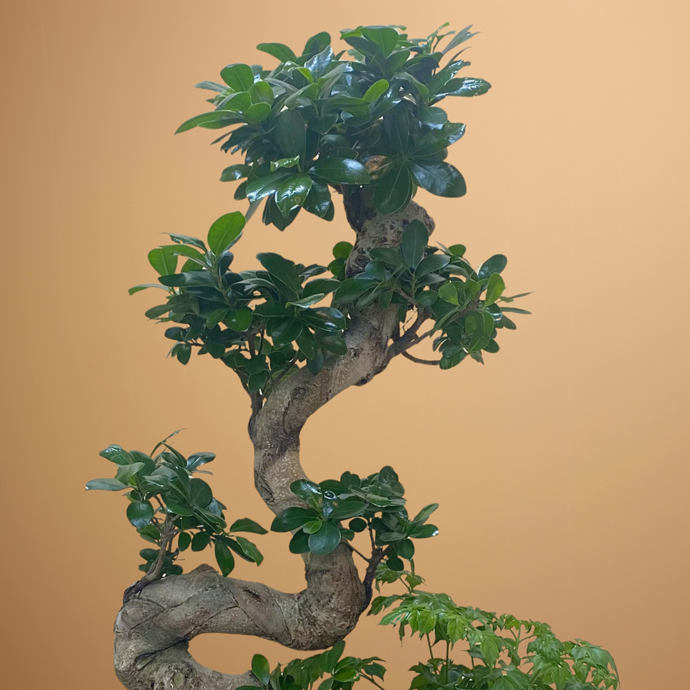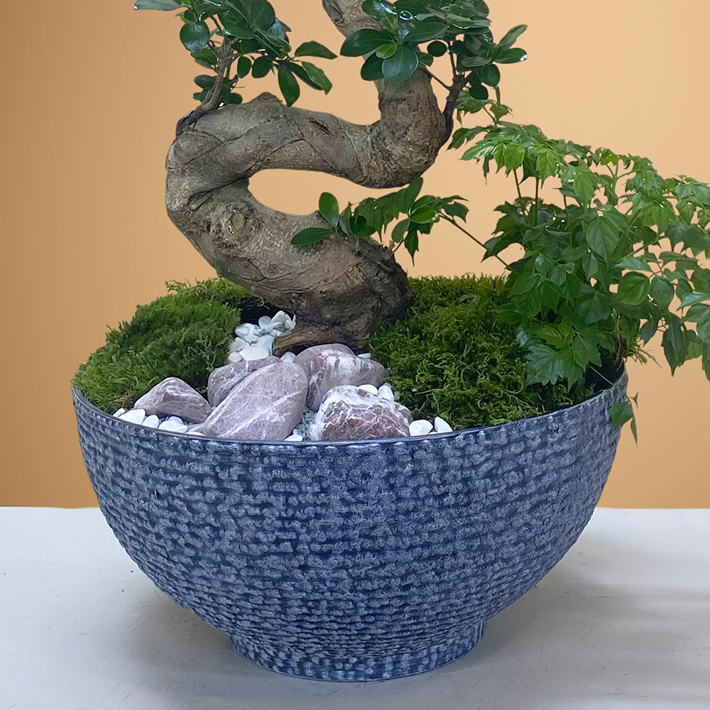 شجرة بونساي من نوع فيكس جينسينغ في وعاء رمادي.