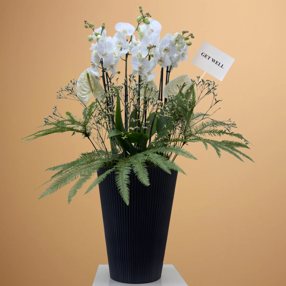 زهور الأنثوريوم البيضاء، أوراق المظلة، الليمونيوم ونباتات الأوركيد، مرتبة بشكل جميل في وعاء من الأخاديد.