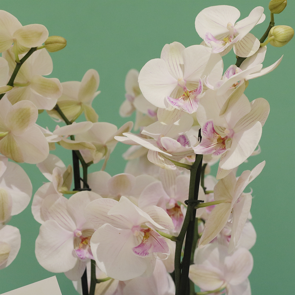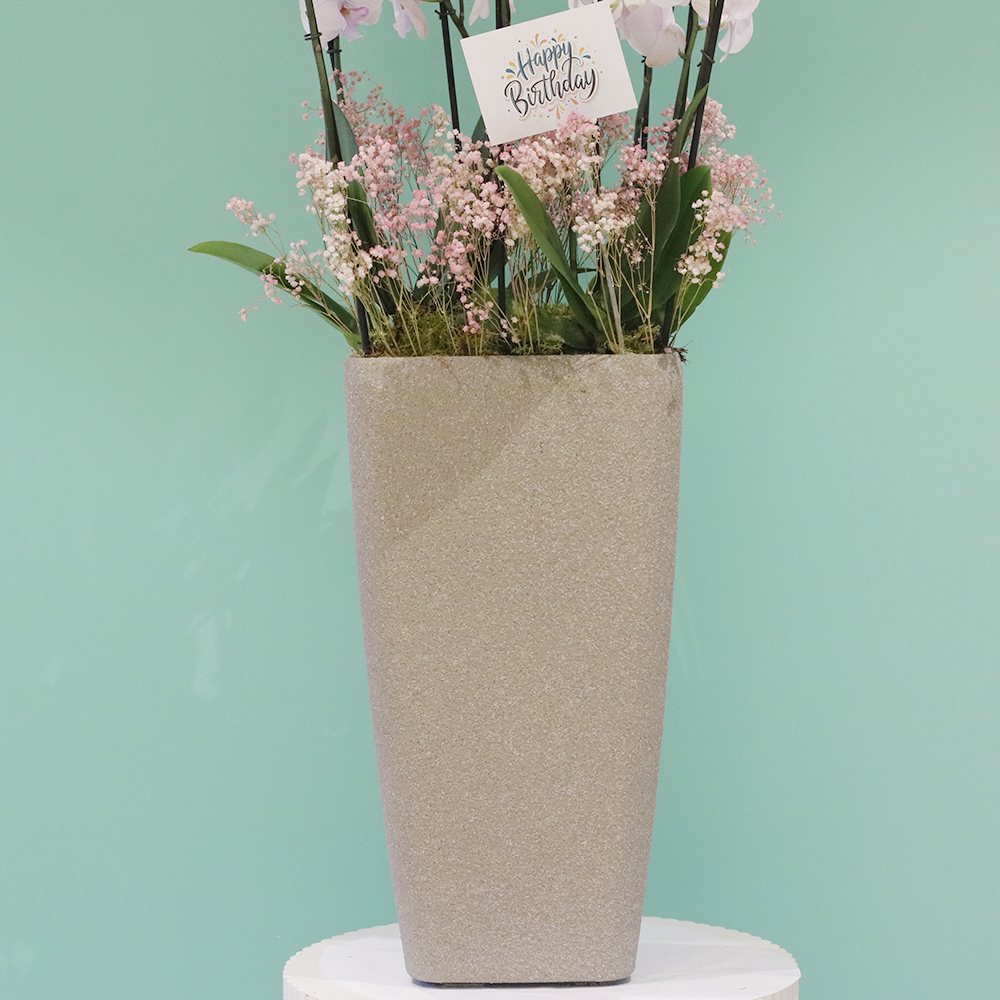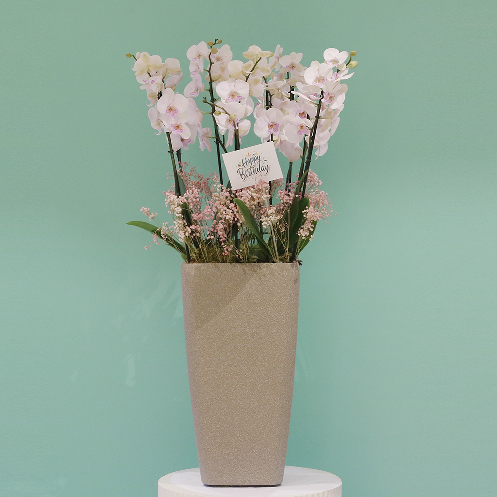 باقةتحتوي على نباتات الأوركيد وزهور الجبسوفيلا الوردية، مرتبة بشكل جميل في فازة فاخرة.