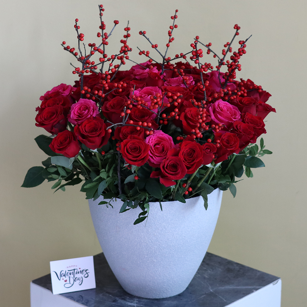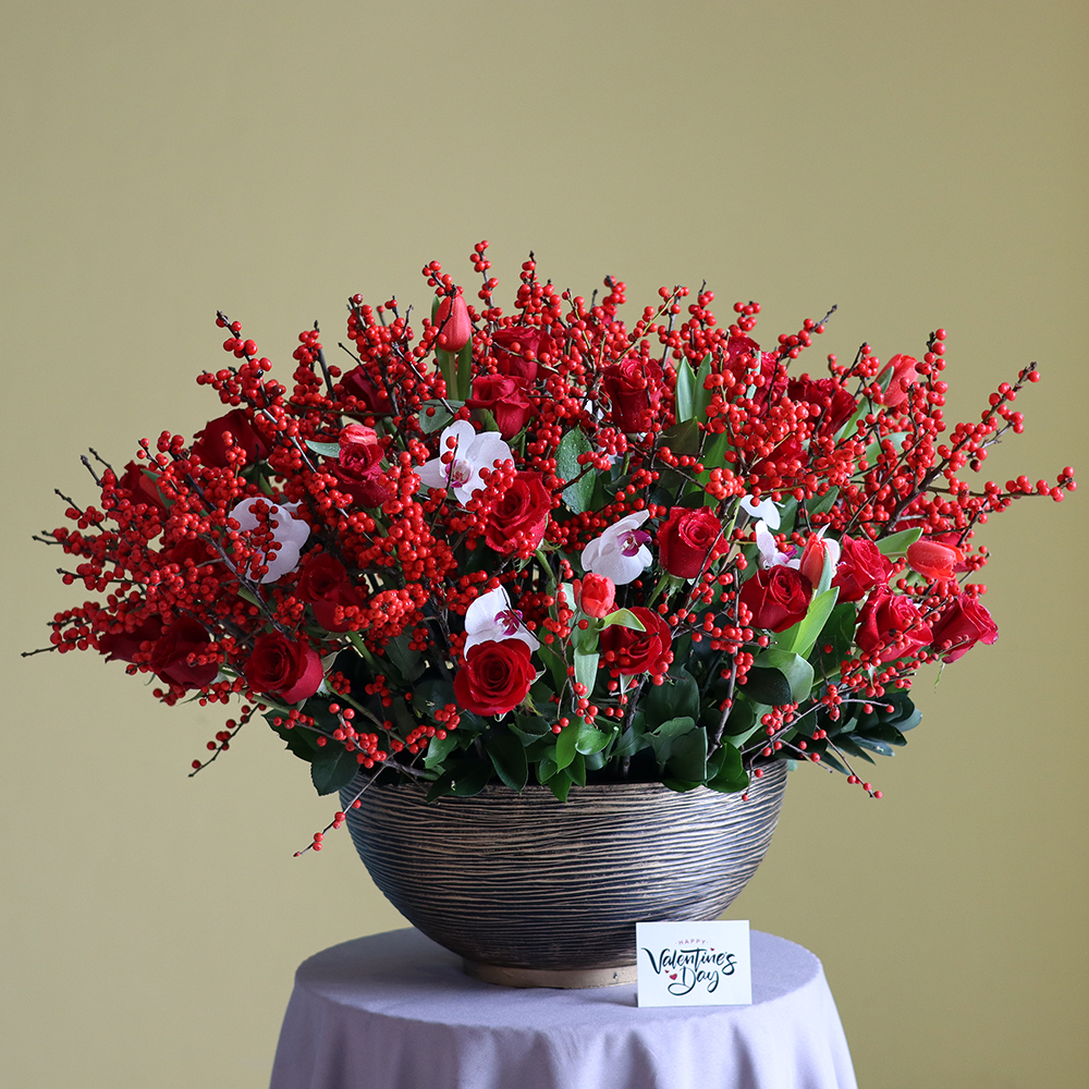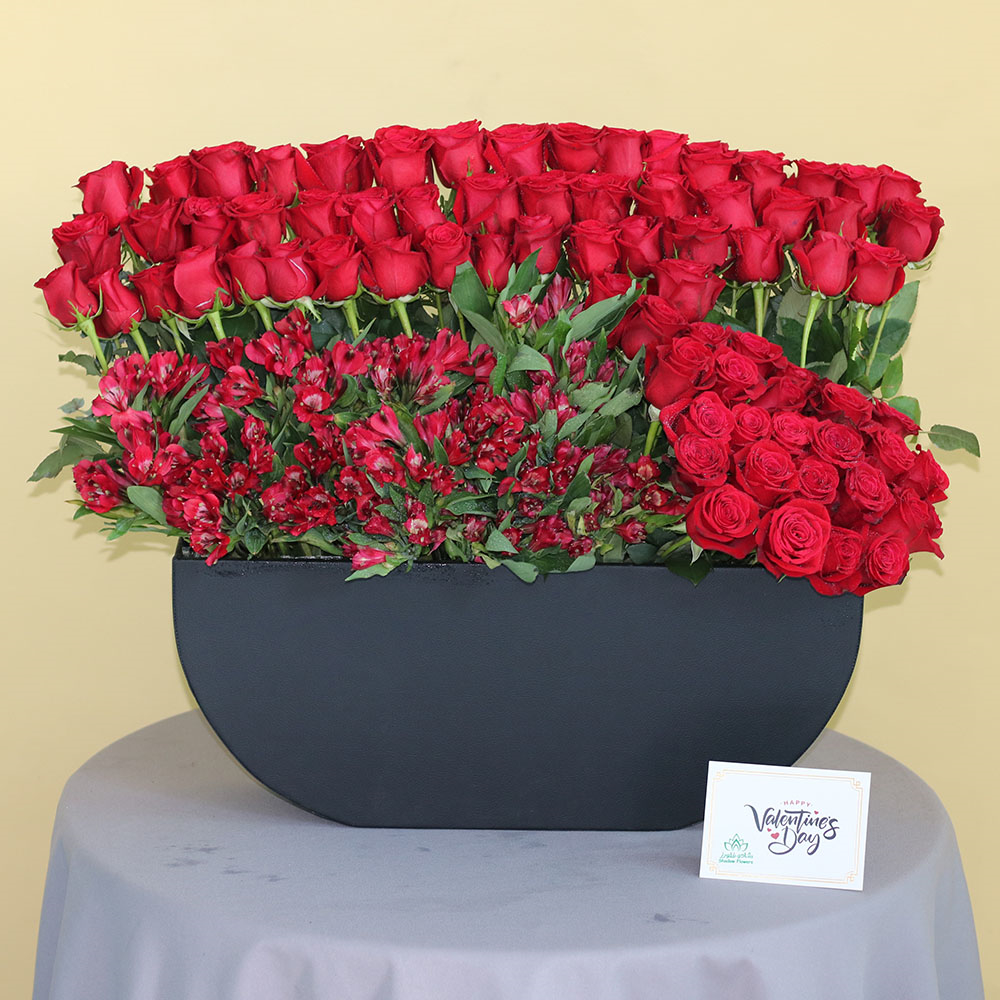 فازة فاخرة تحتوي على نباتات الأوركيد الأرجوانية وأزهار السترومريا.