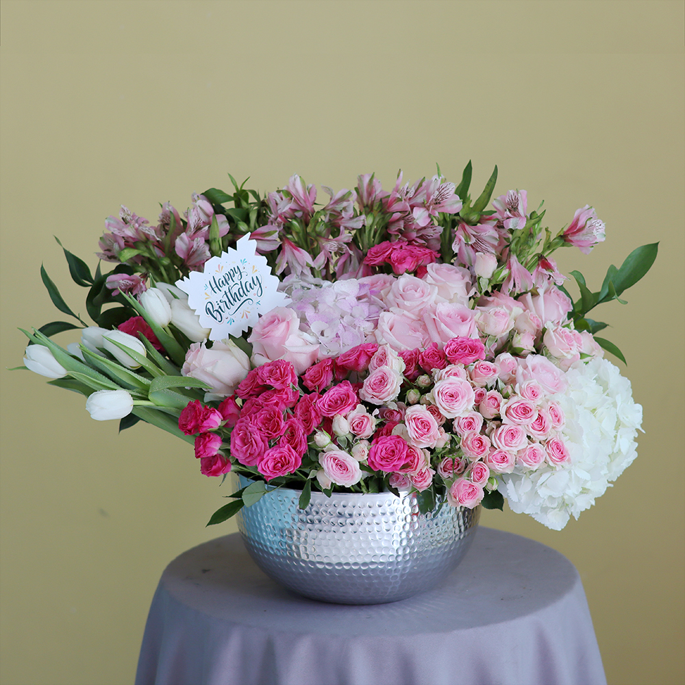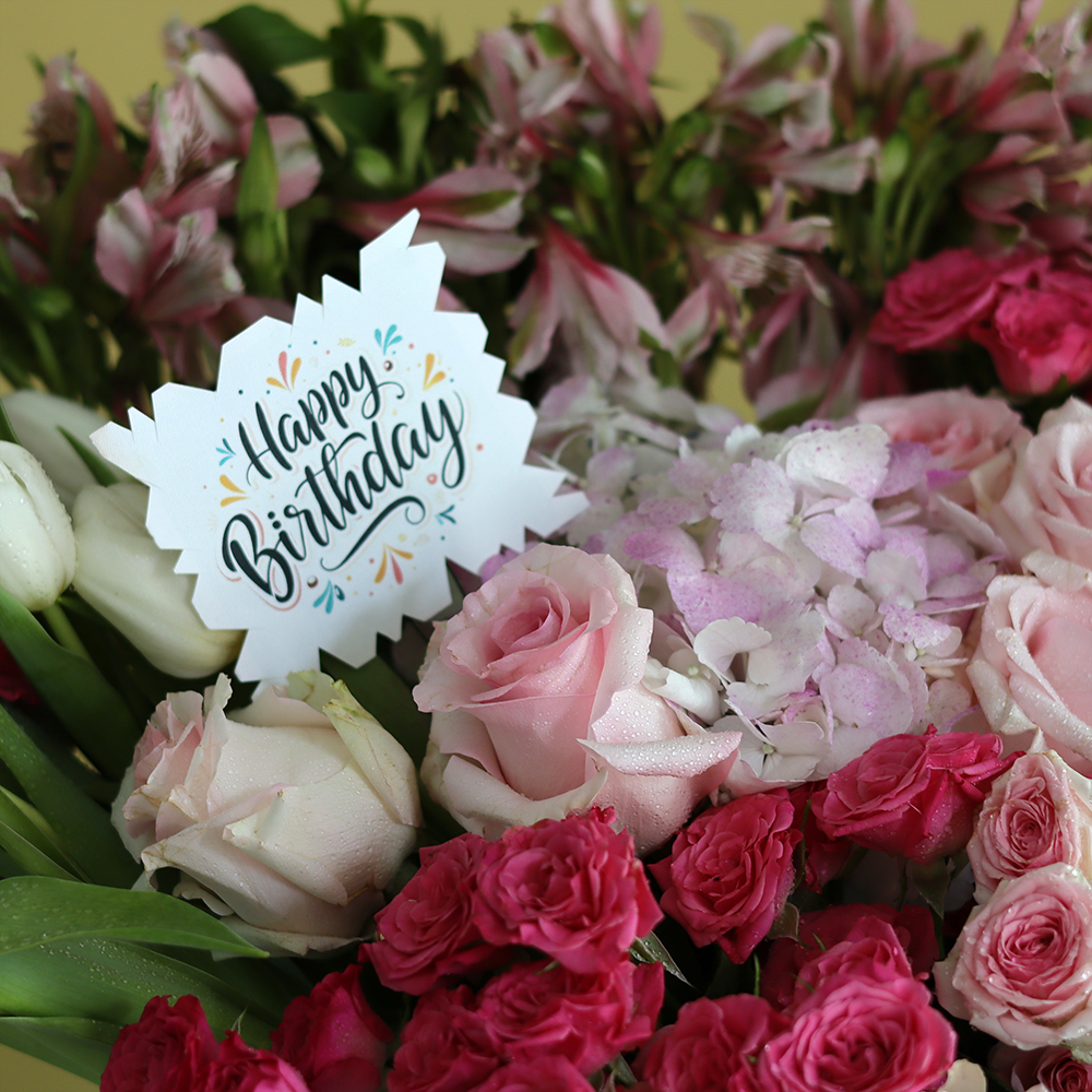 باقة أنيقة تتميز بأزهار الكوبية، الجوري، التوليب والسترومريا.