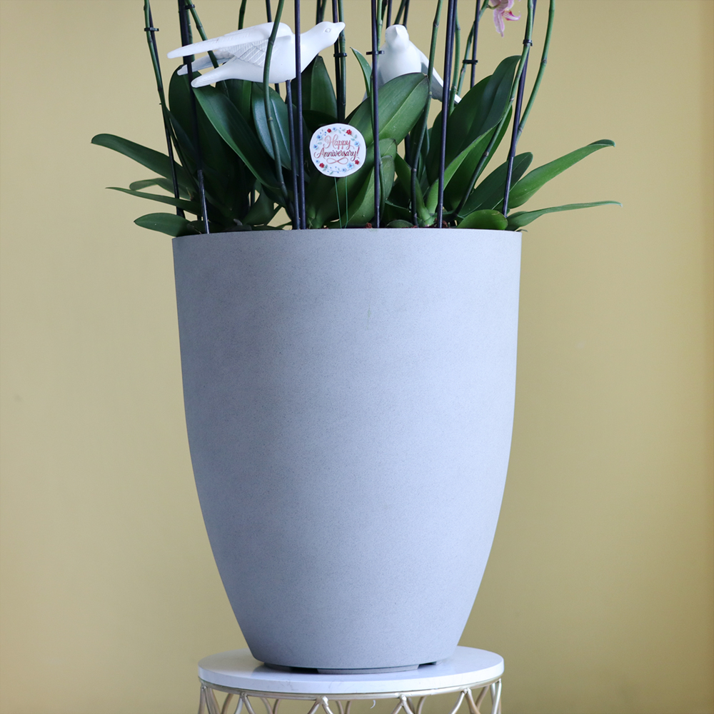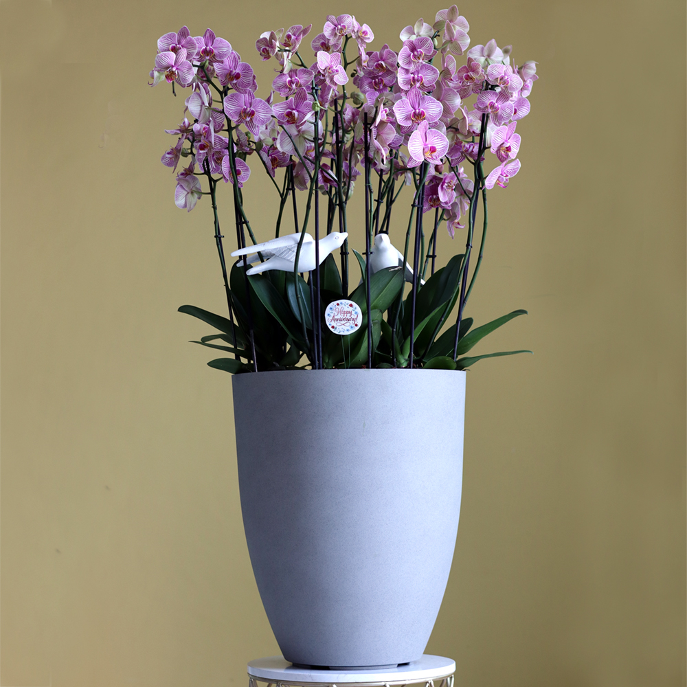 باقة تحتوي على نباتات الأوركيد الوردية، مرتبة بشكل جميل في فازة فاخرة.