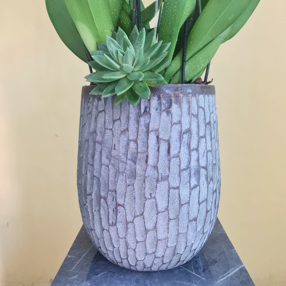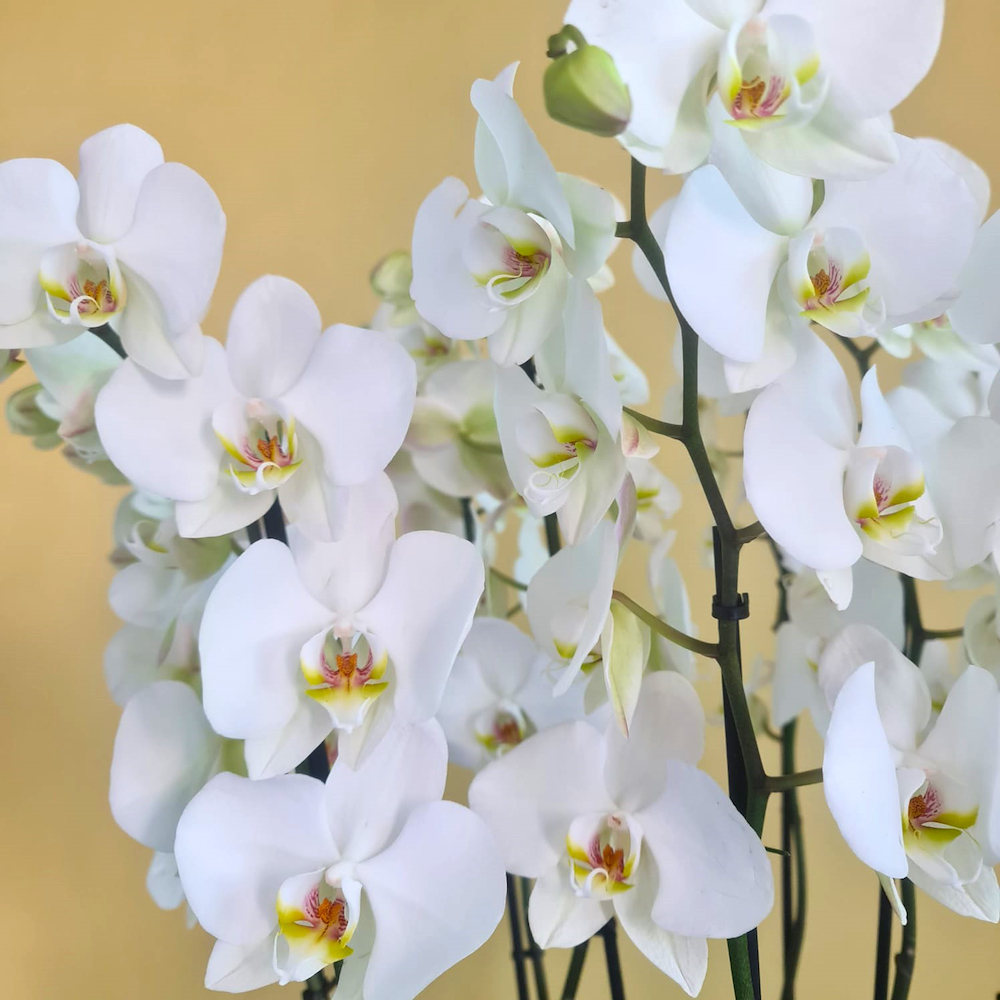فالاينوبسيس بيضاء مع نبات إيشيفيريا في فازة بنية فاخرة.