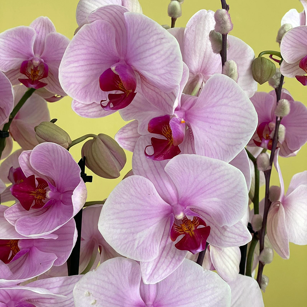 فازة فاخرة مليئة بنباتات الأوركيد الأنيقة.