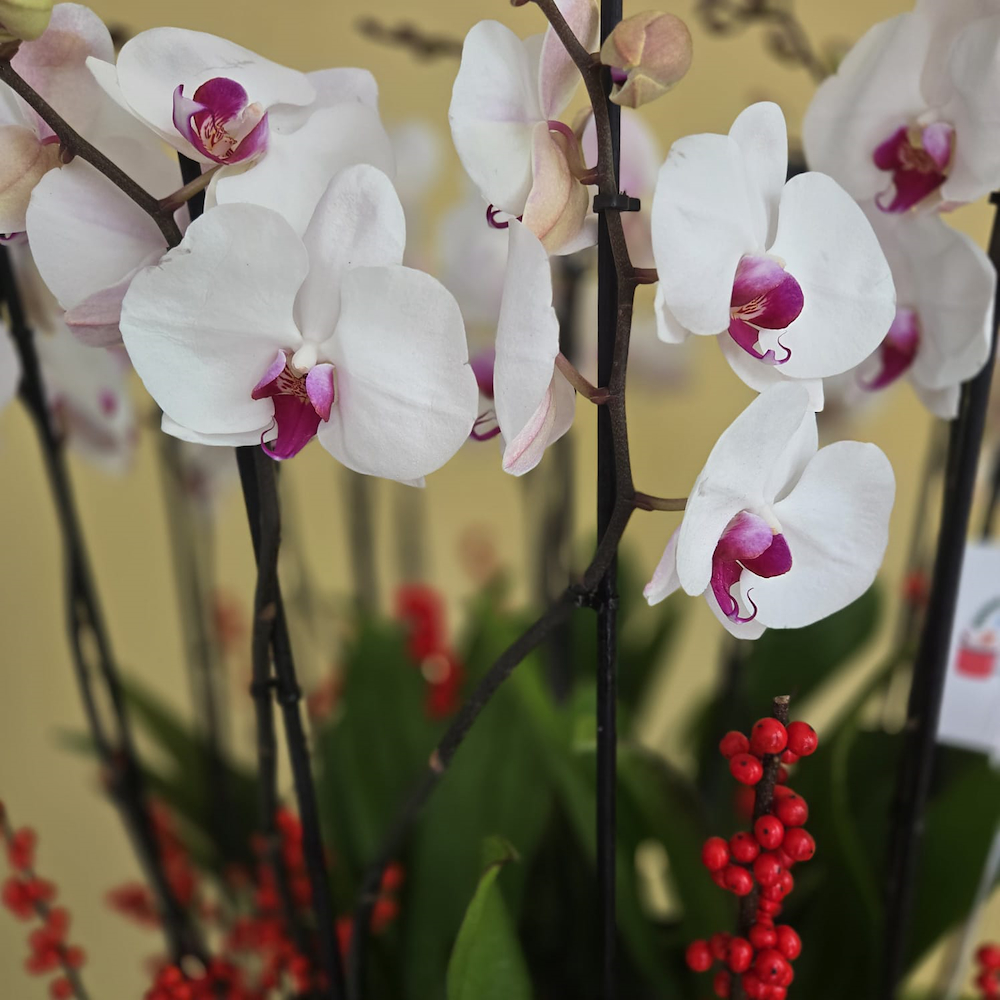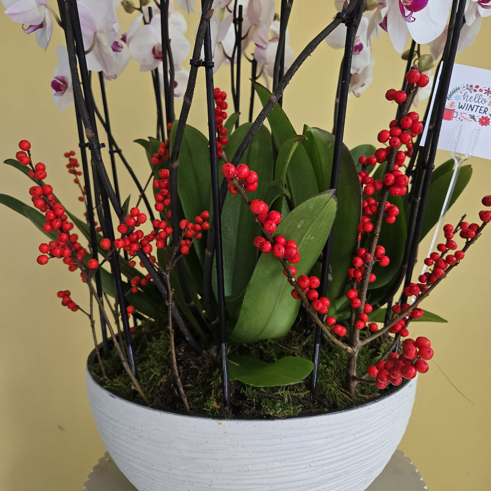 ترتيب جميل من نباتات الأوركيد والإيلكس في فازة بيضاء.