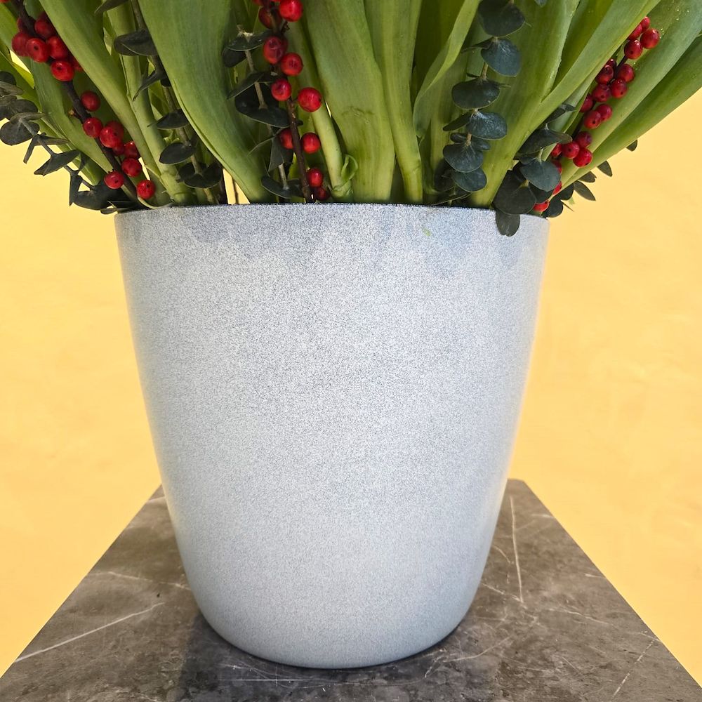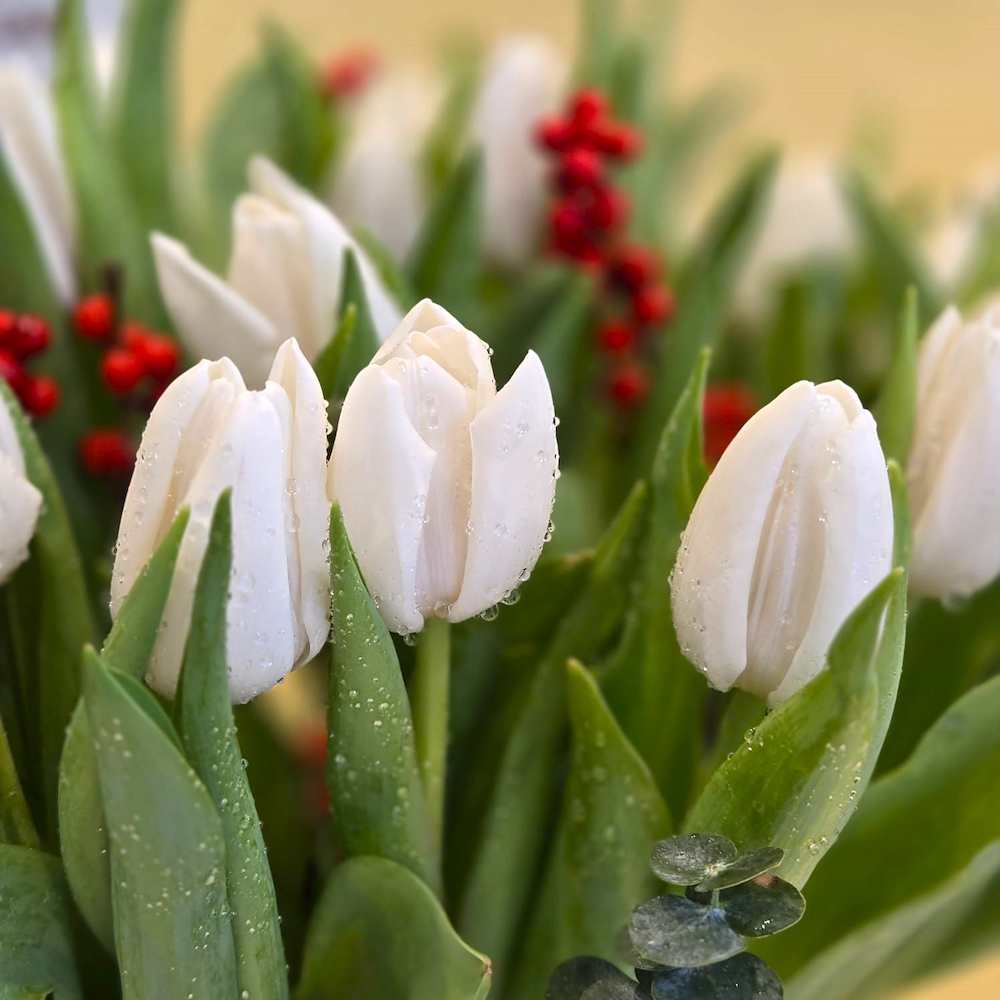 باقة من زهور الإيلكس والتوليب مرتبة في مزهرية فاخرة.