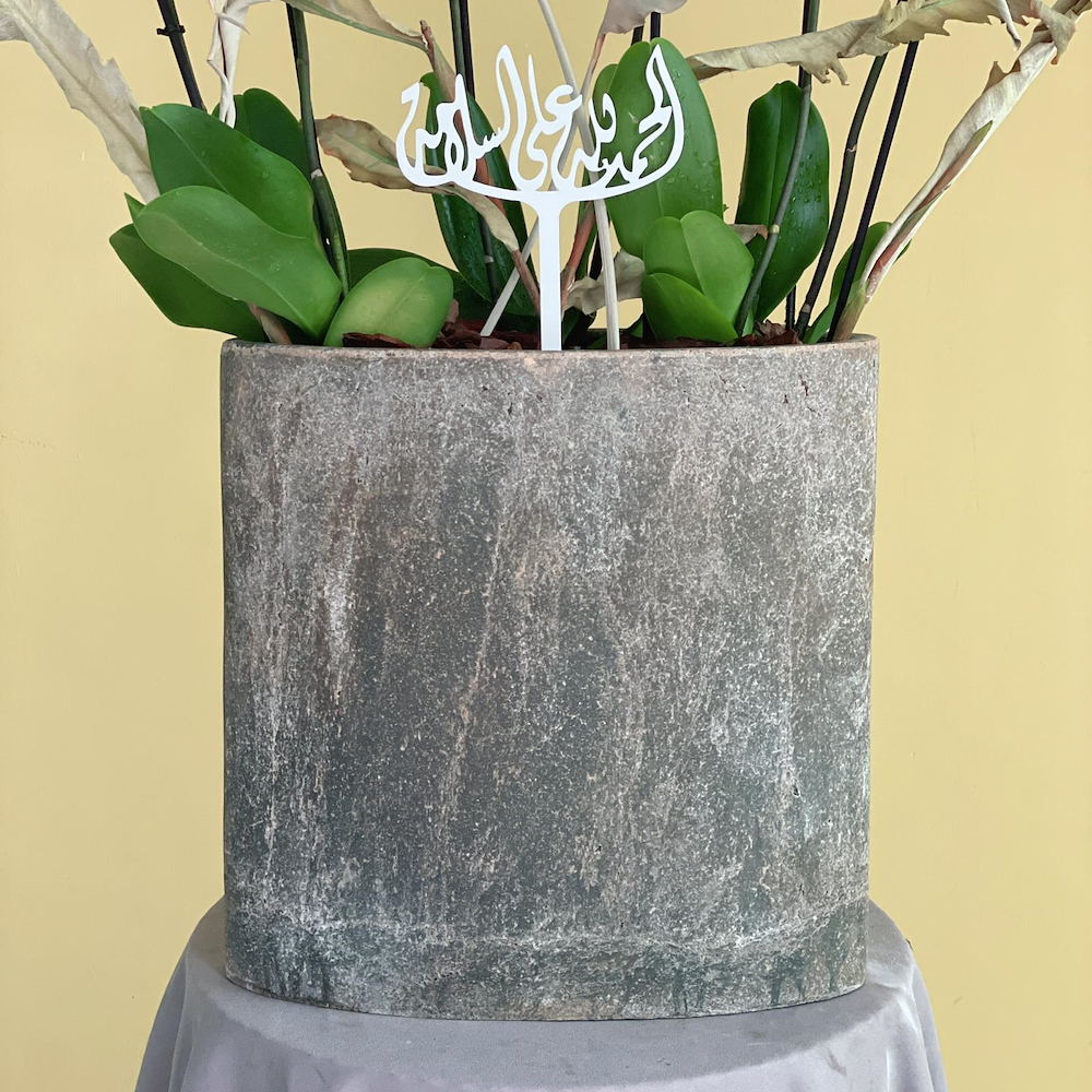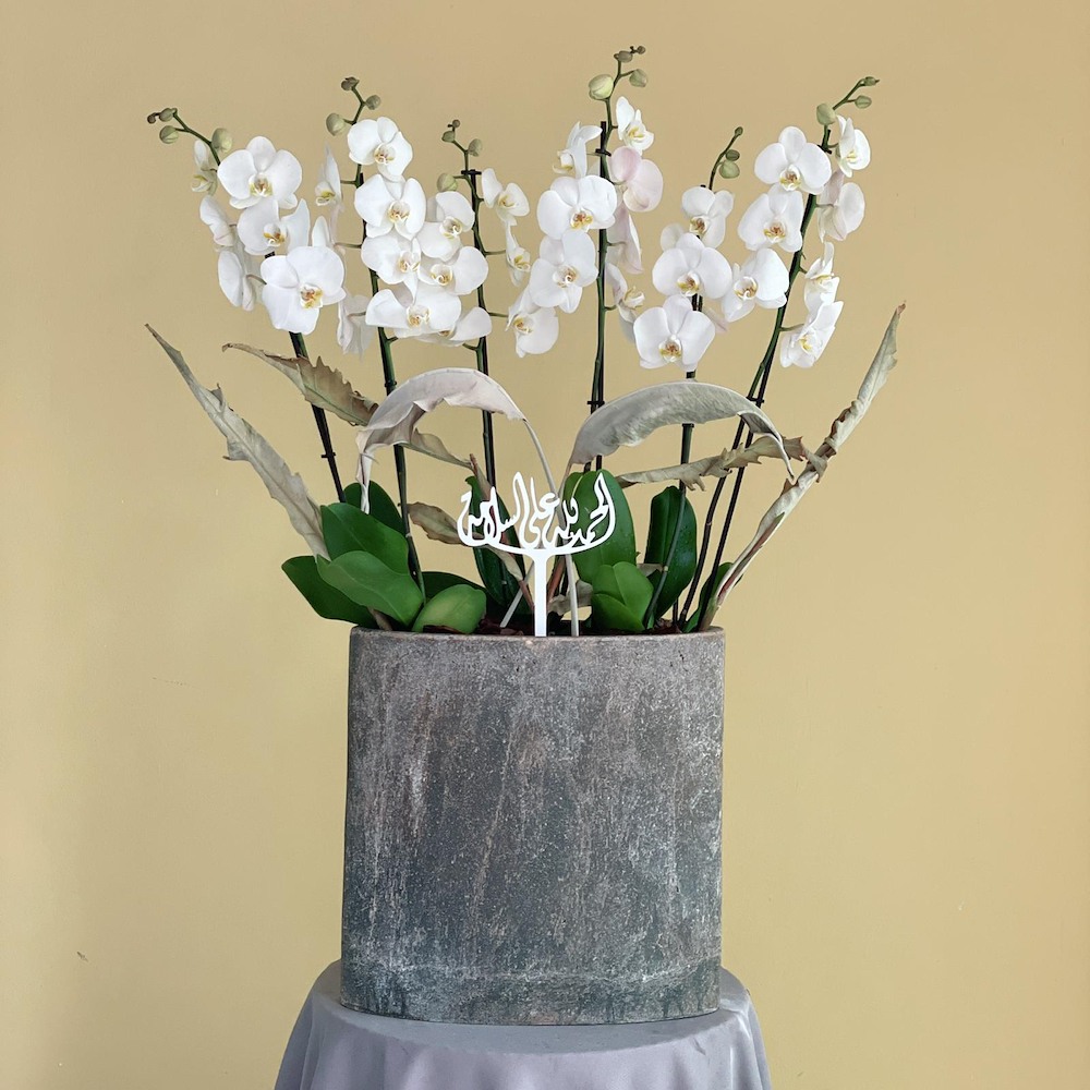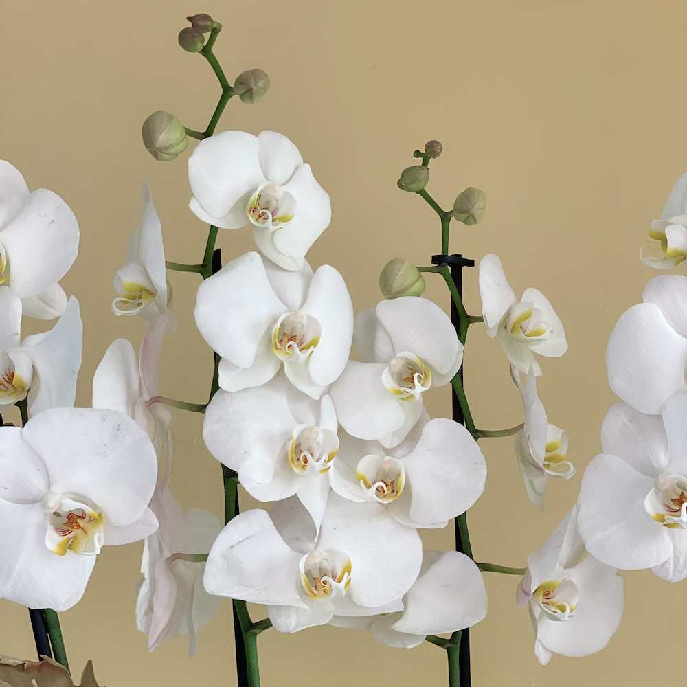 أوركيد بيضاء مذهلة في فازة فاخرة.