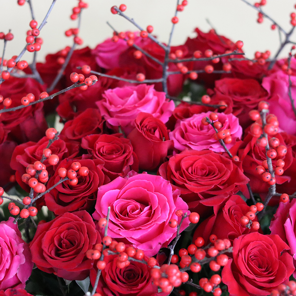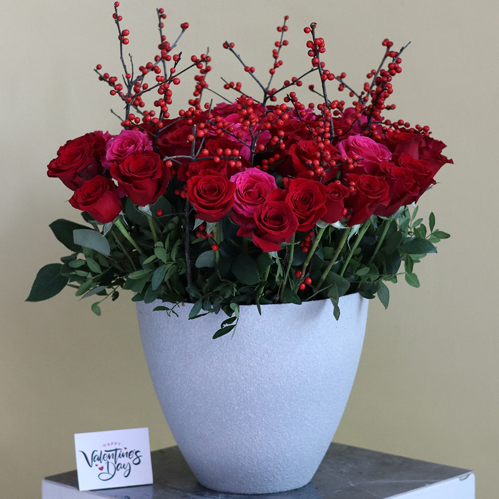 باقة تحتوي على الجوري الأحمر والوردي مع الإيليكس، مرتبة بشكل جميل في فازة.