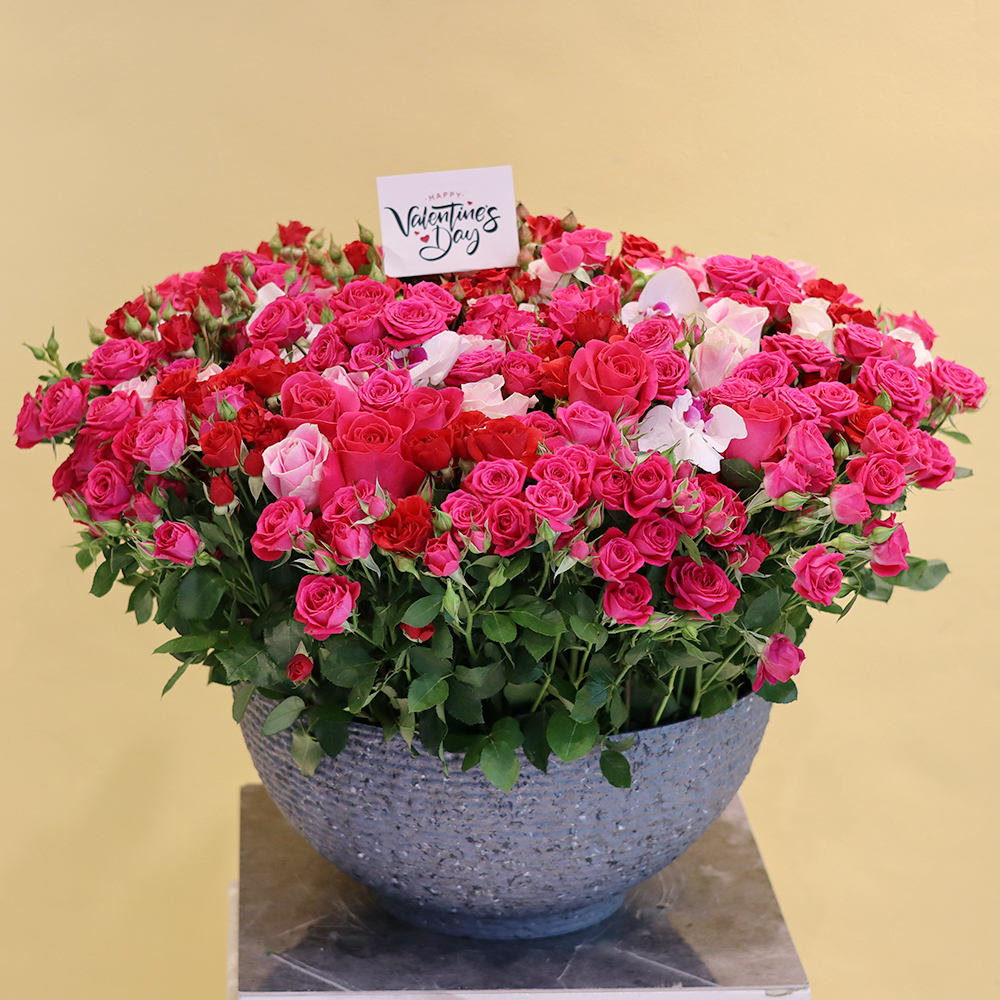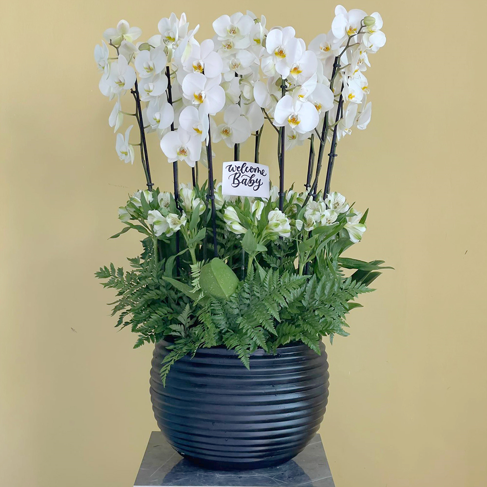نباتات الأوركيد المذهلة باللون الوردي الفاتح في فازة سوداء فاخرة.